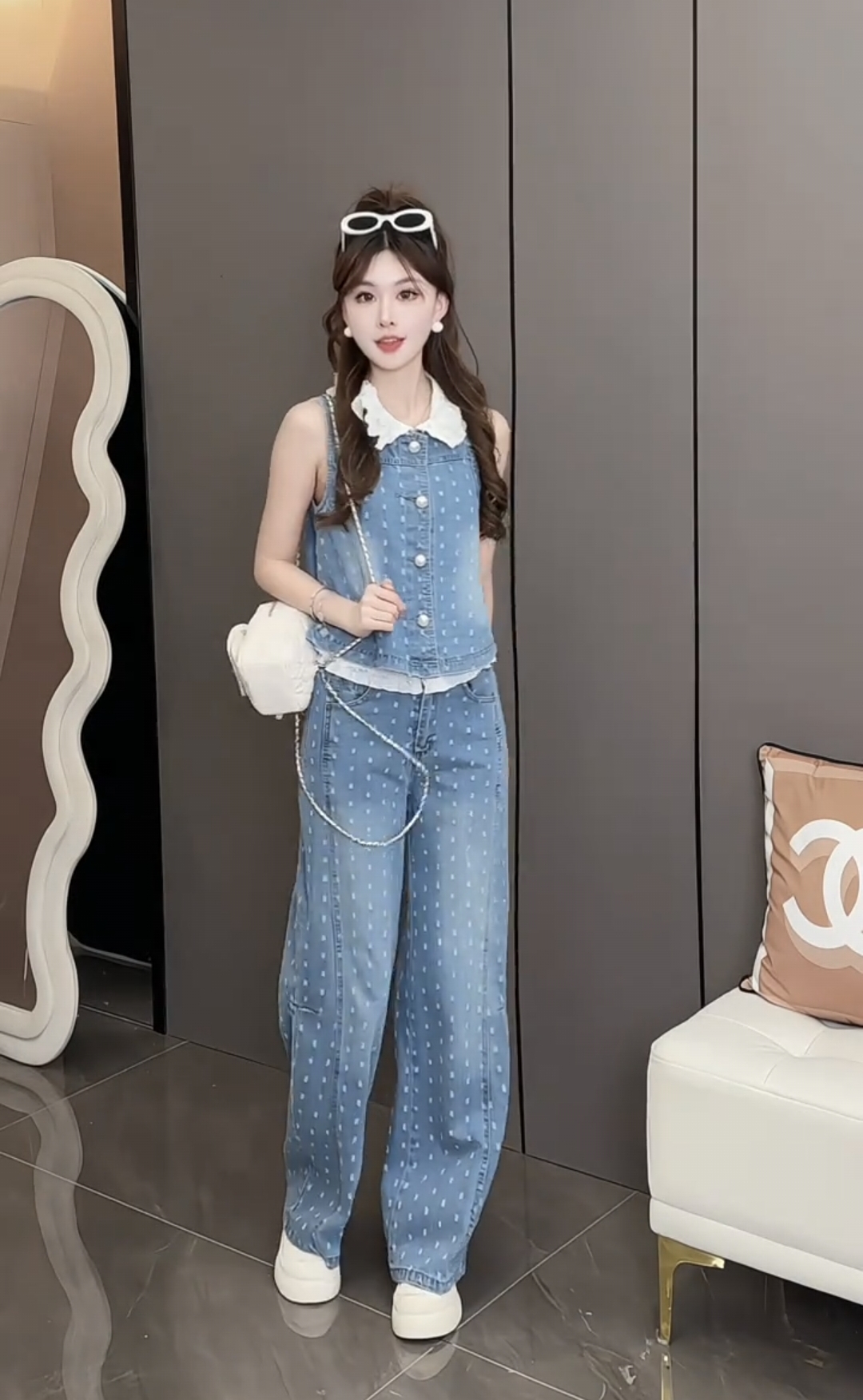 작은 샤넬 스타일 세트 여름 2026 새로운 폭발 레이스 레이스 데님 베스트 와이드 레그 팬츠 고급 센스 투피스 세트