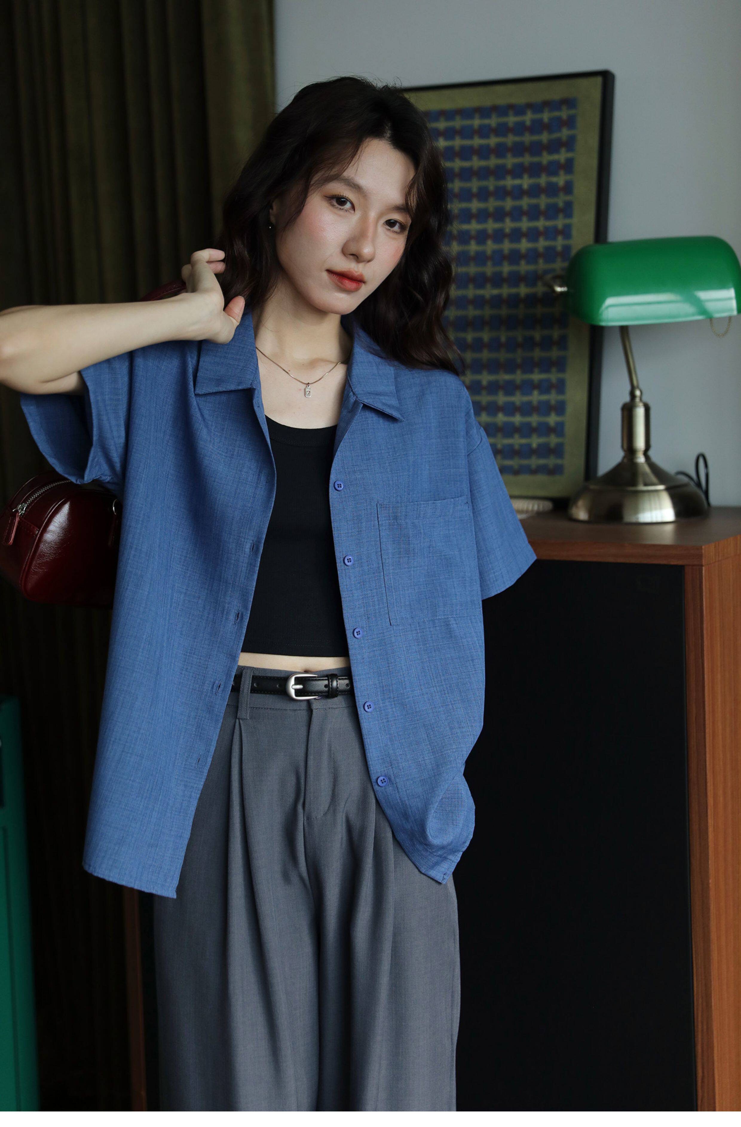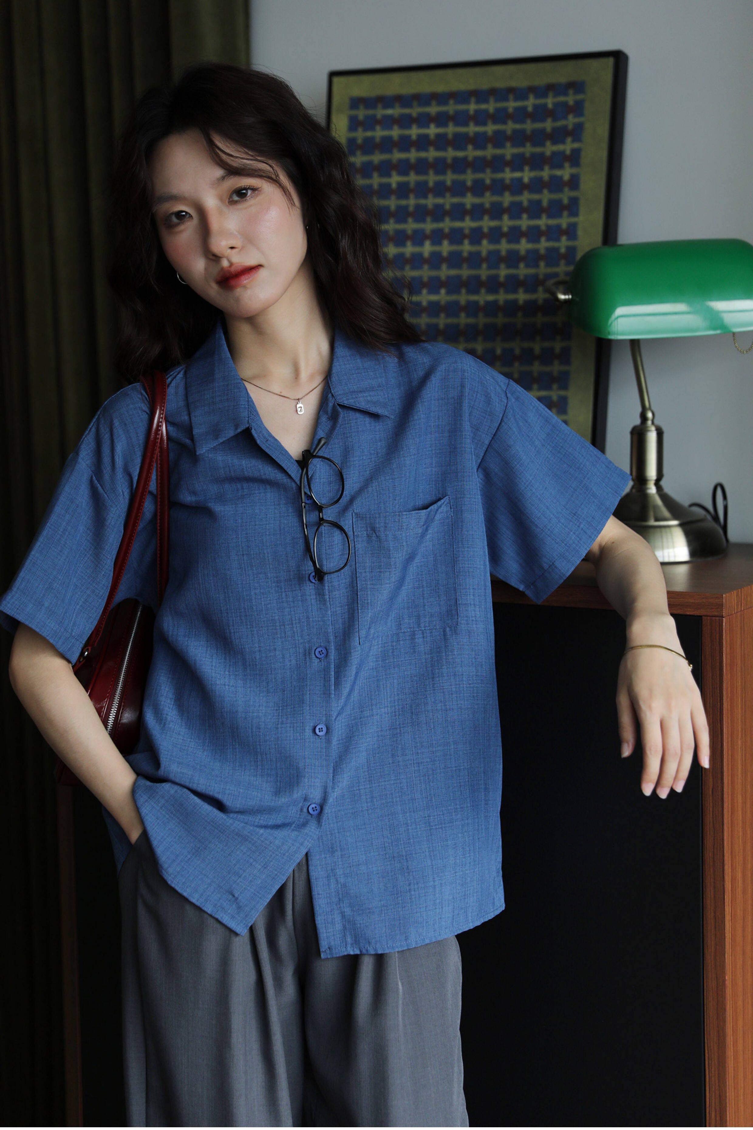 실사 파란색 루즈핏 체크무늬 반팔 여성 셔츠 여름 미니멀리즘 품격 한국 스타일 다용도 셔츠
