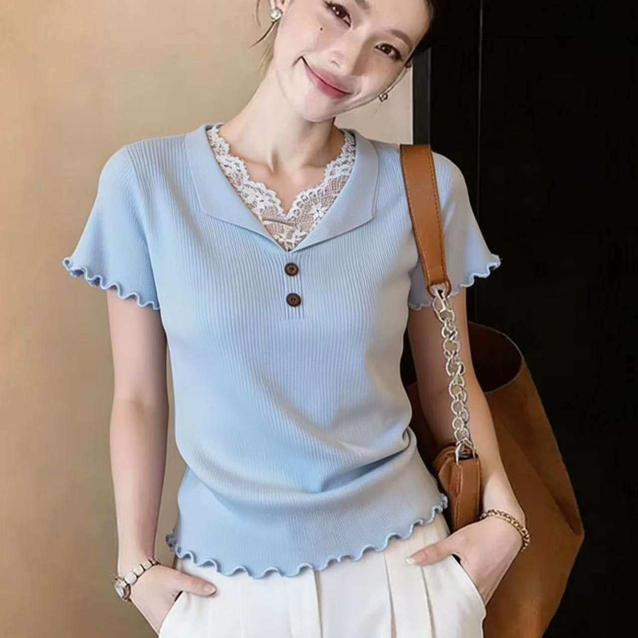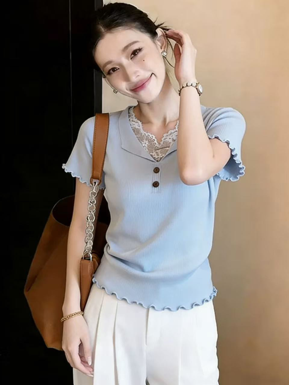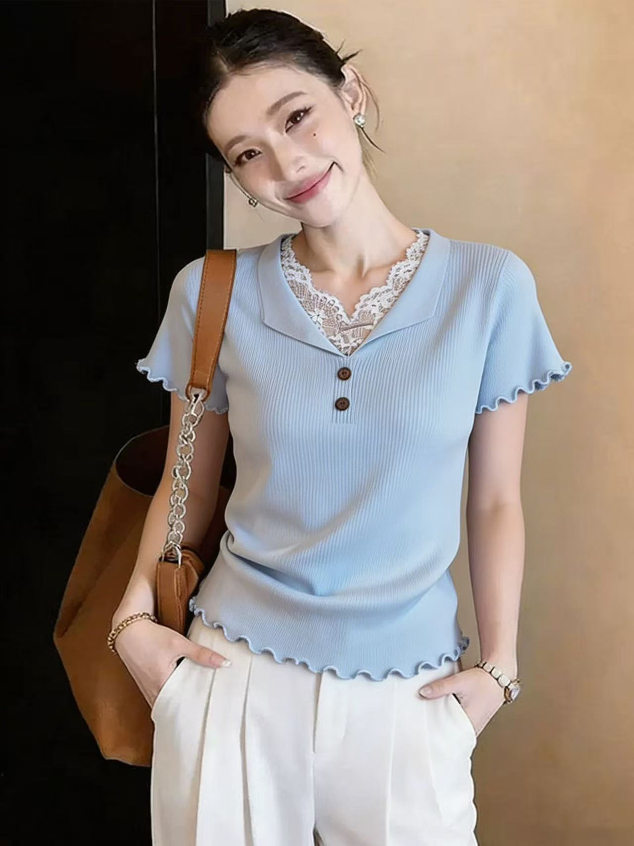 프릴 레이스 조각 V넥 반팔 니트 스웨터 여성 2026 새로운 여름 패션 외국 가스 페이크 레이어드 맨위