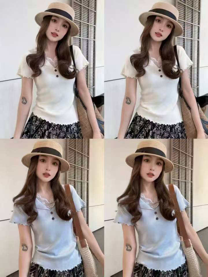 실사 아름다운 나비 매듭 프랑스식 홀로우 아웃 얼음 실크 니트 반팔 티셔츠 여성 레이스 레이스 쇼트 스타일 작은 셔츠 맨위