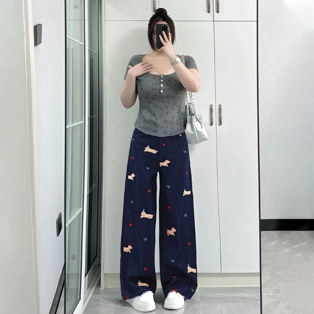 2026 강아지 패턴 디자인 넓은 다리 청바지 여성 트렌드 루즈핏 다용도 캐주얼 도루 센스 스트레이트 바닥 청소 긴 바지