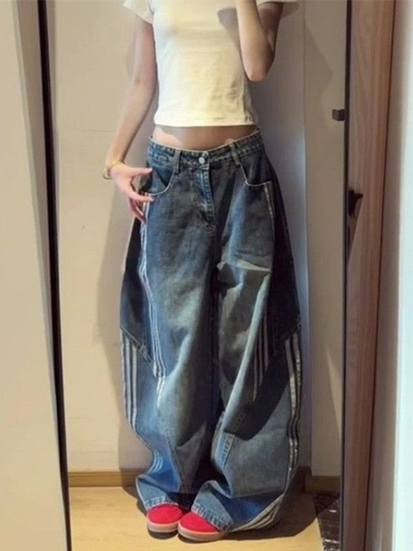 아메리칸 레트로 워싱 해체 모통이 칼 청바지 여성 3개 바 스트라이프 패치워크 넓은 다리 루즈핏 바닥 청소 롱 바지