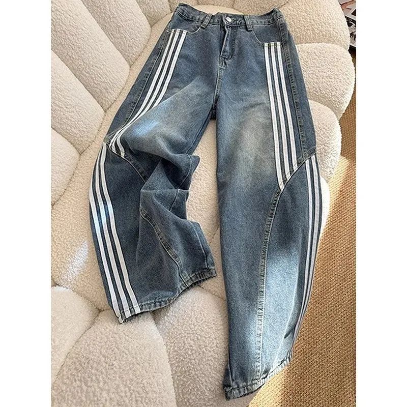 한 부서 레트로 워싱 트리플 바 모통이 칼 청바지 여성 봄 여름 루즈핏 아메리칸 슬림해 보이는 스트라이프 넓은 다리 바닥 청소 바지