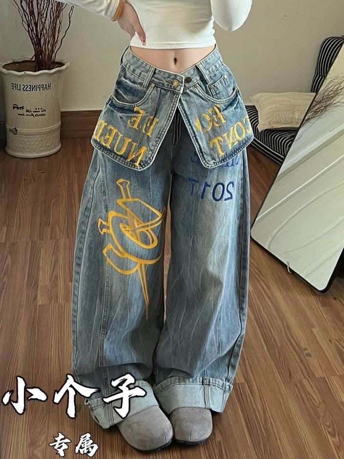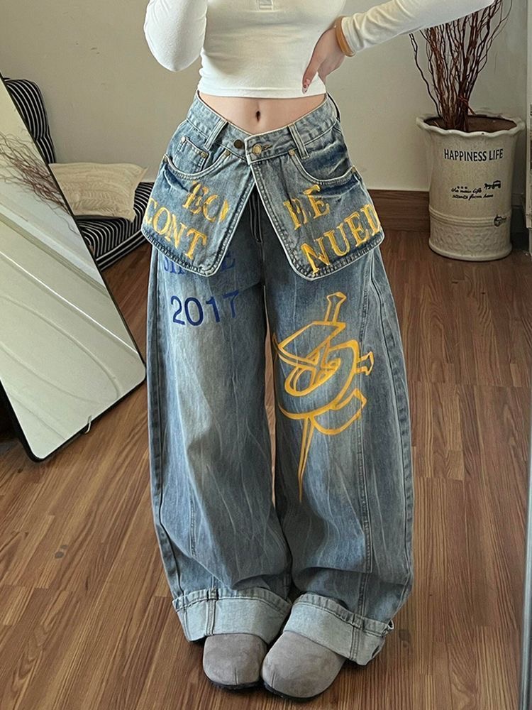 아메리칸 높음 거리 더블 허리 가져 가라. 조각 프린트 청바지 아이들 핫걸 페이크 레이어드 스택 착용 슬림해 보이는 바닥 청소 넓은 다리 길이 바지