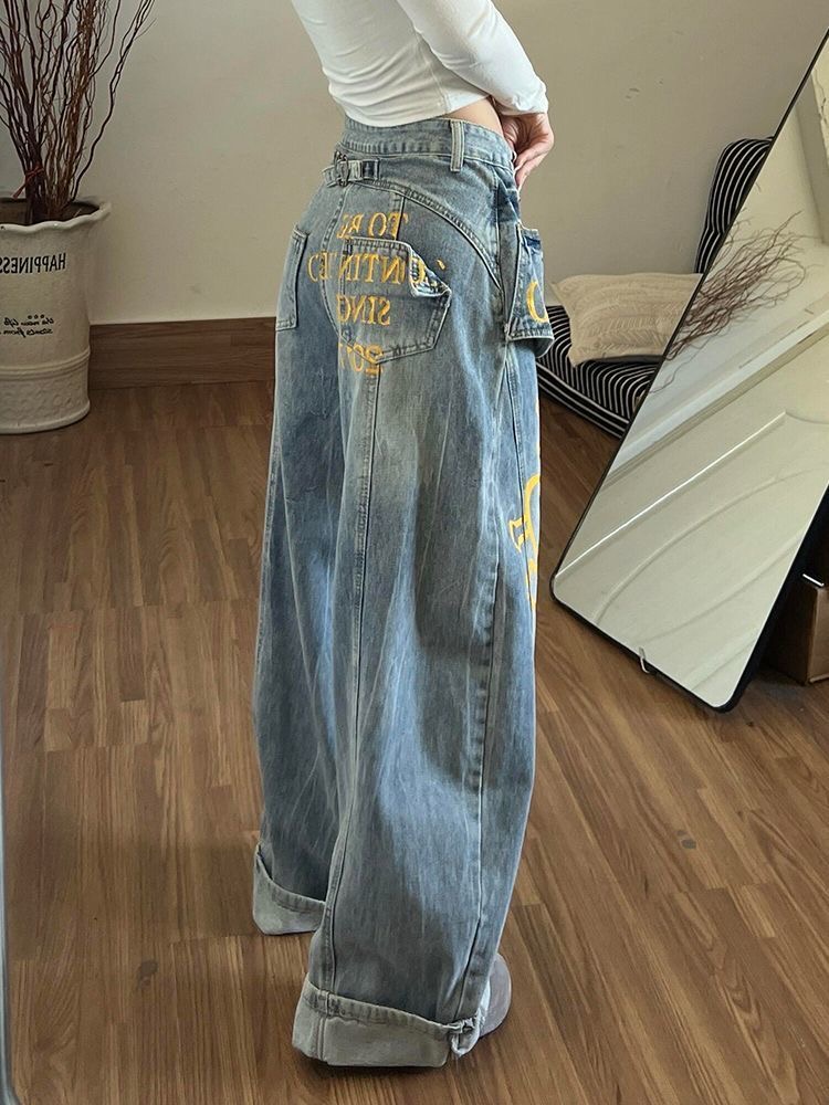 아메리칸 이전 주머니 알파벳 프린트 청바지 여성 봄 가을 디자인 센스 작은 대중 루즈핏 거리 개성 바지