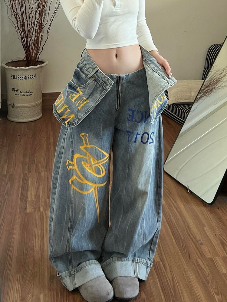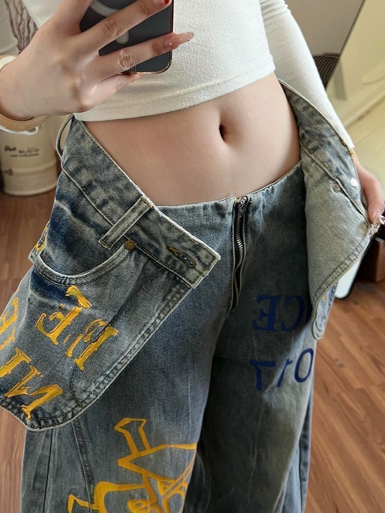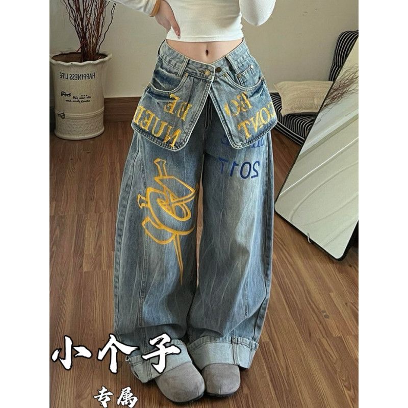 한 부서 디자인 센스 더블 허리 가져 가라. 조각 알파벳 프린트 청바지 여성 2026 가을 아메리칸 슬림해 보이는 모통이 칼 와이드 레그 팬츠