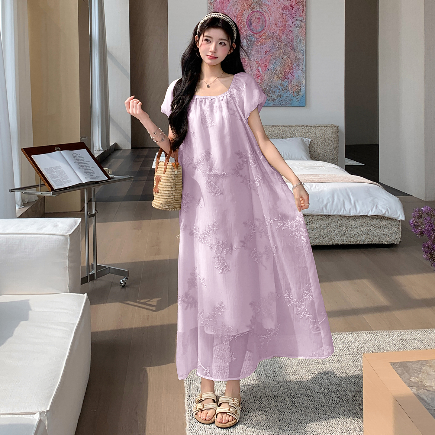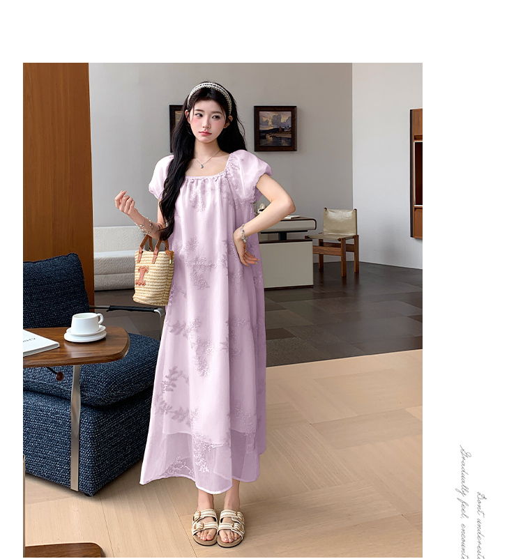 실사 지금 2026 여름 라미 드레스 루즈핏 우아한 단색 큰 진자 롱 스커트 소매 얇은 스타일 인형 치마