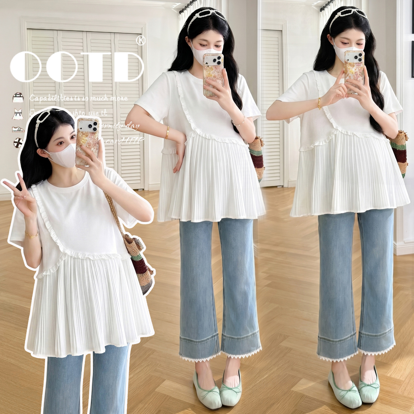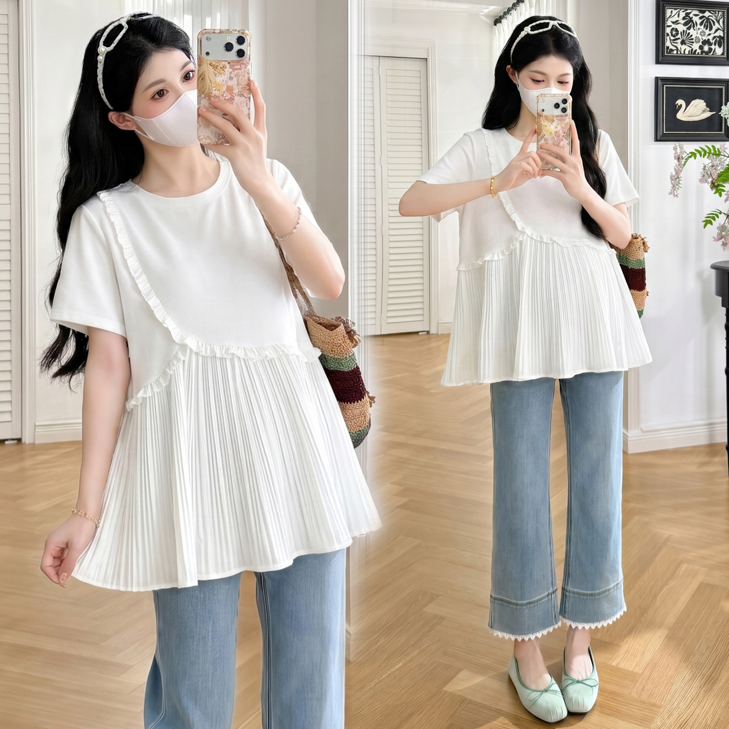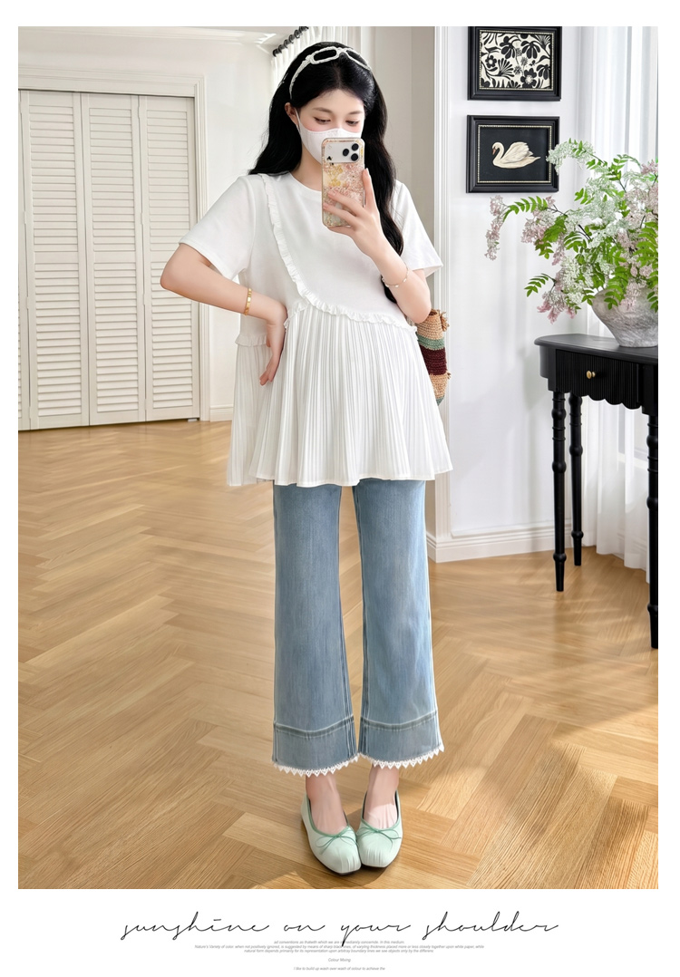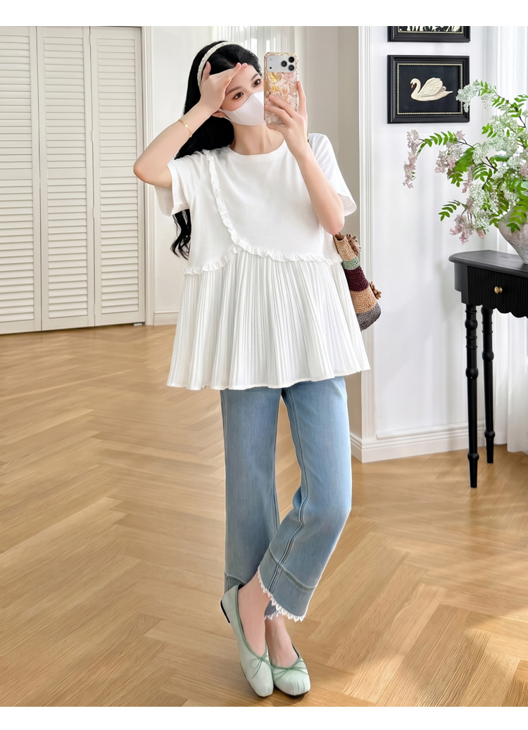 실사 여름 한국 스타일 루즈핏 디스플레이 화이트 레이스 맨위 프릴 반바지 임신 엄마 캐주얼 차가운 세트