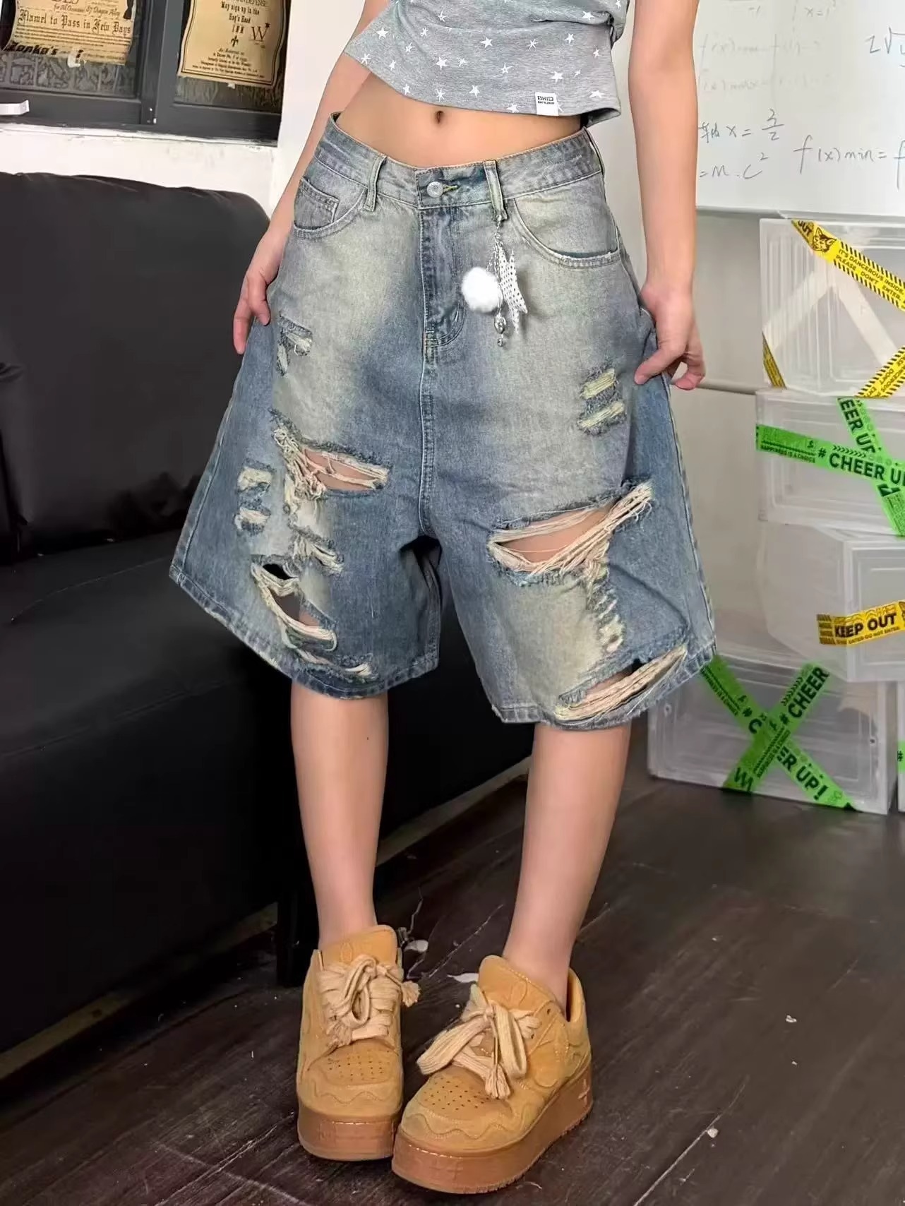 아메리칸 국가 트렌디 워싱 찢어진 부분 세련된 데님 오부 바지 남녀 여름 루즈핏 캐주얼 다용도 트렌드 넓은 다리가 짧다. 바지