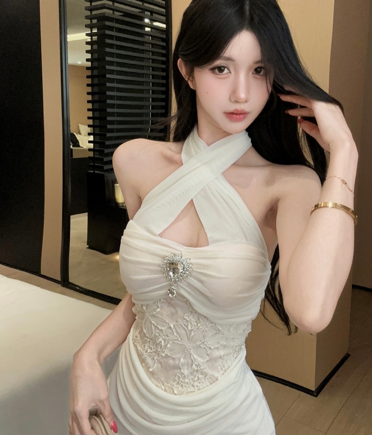 실사 순수한 욕망 품격 레이스 조각 망사 행침 목 핫걸 백리스 레이스업 주름 허리 수축 미니 스커트