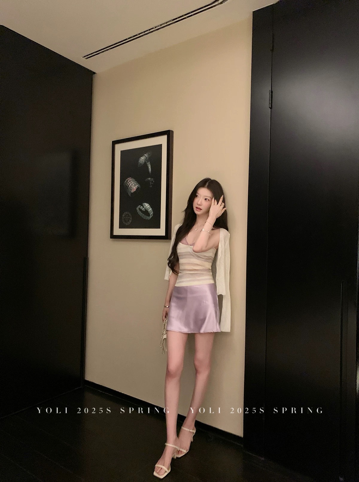 yoli 장 宥 이익 모네 꽃 보라색 새틴 광택 한 마디 반신 스커트 여성 여름 부드러운 미니 스커트