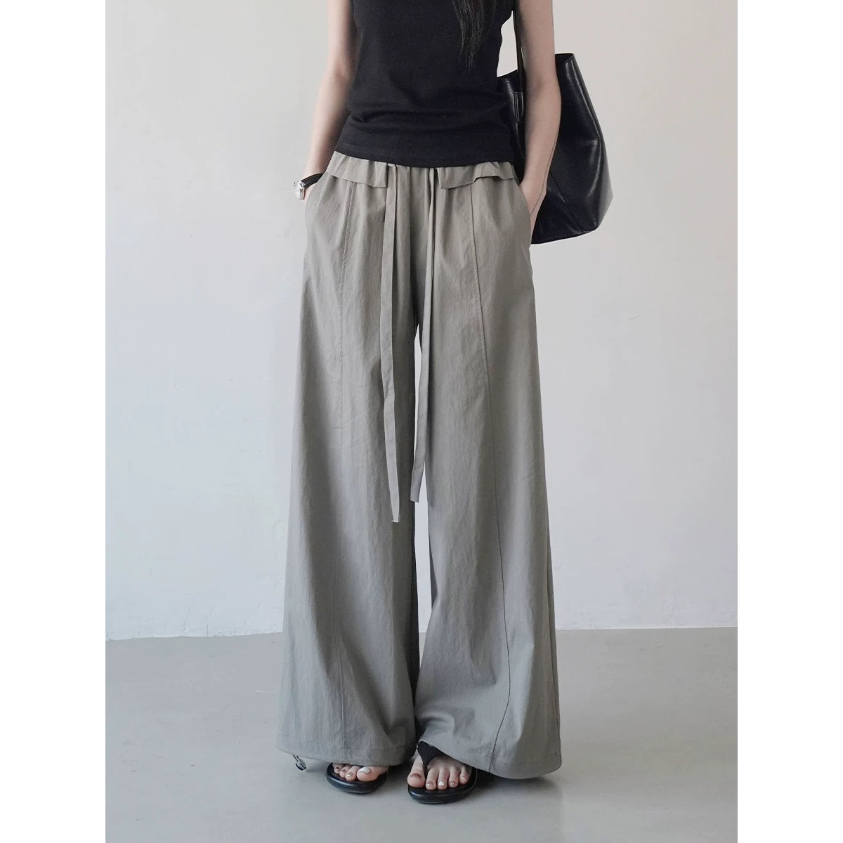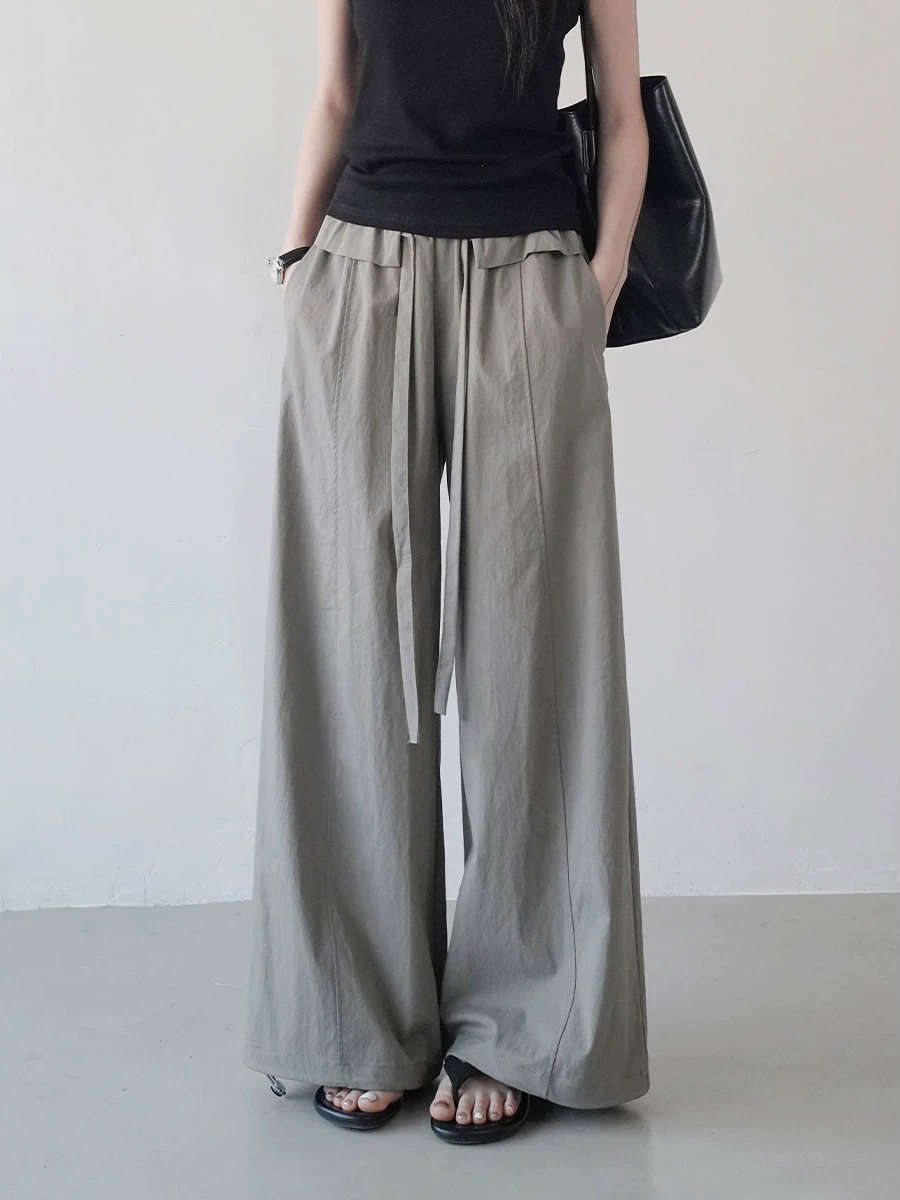 실사 얇고 가벼운 느긋한 도루 센스 치마바지 여성 2026 여름 펌프 로프 주름 캐주얼 바지 루즈핏 슬림해 보이는 와이드 레그 팬츠