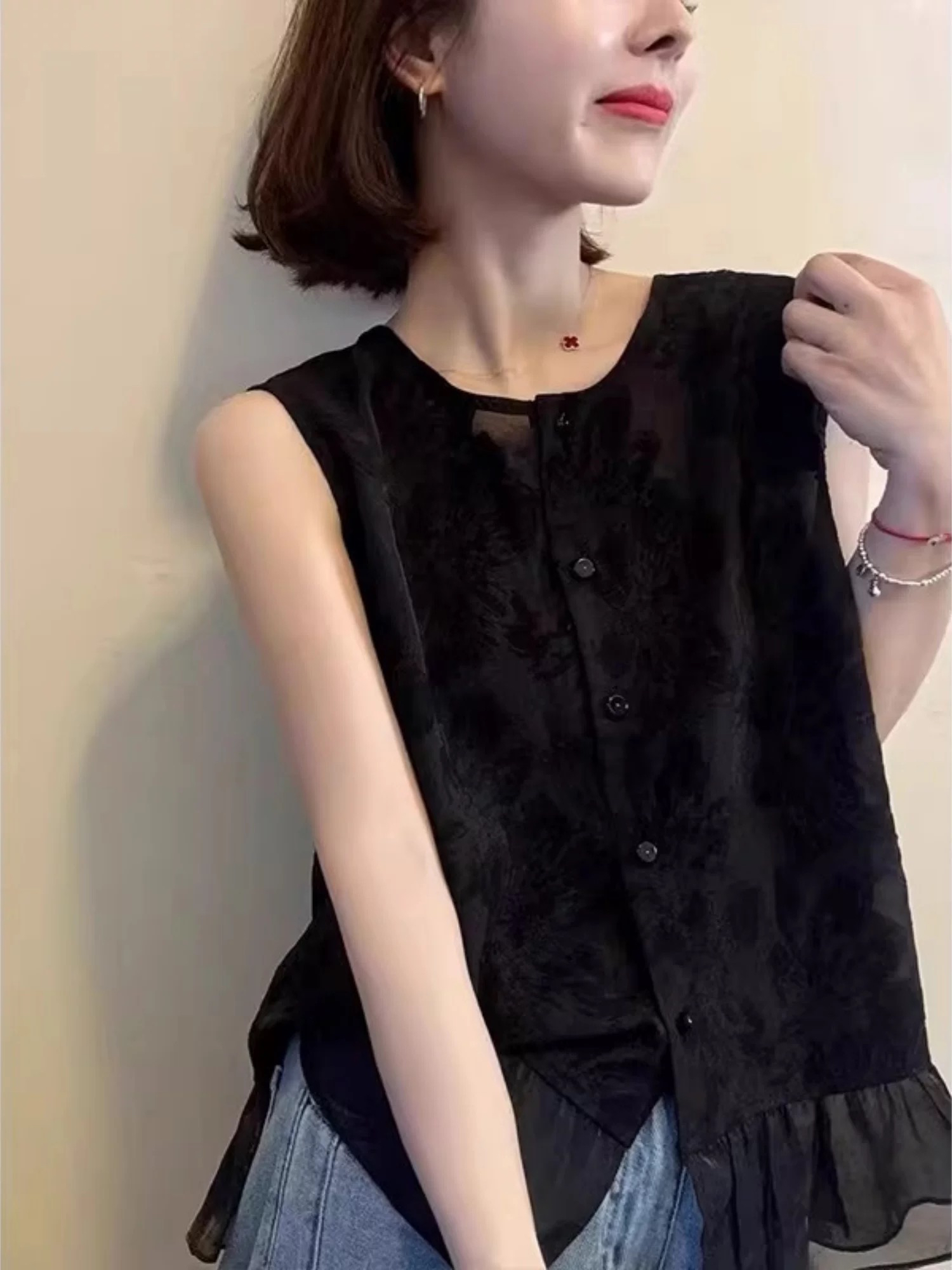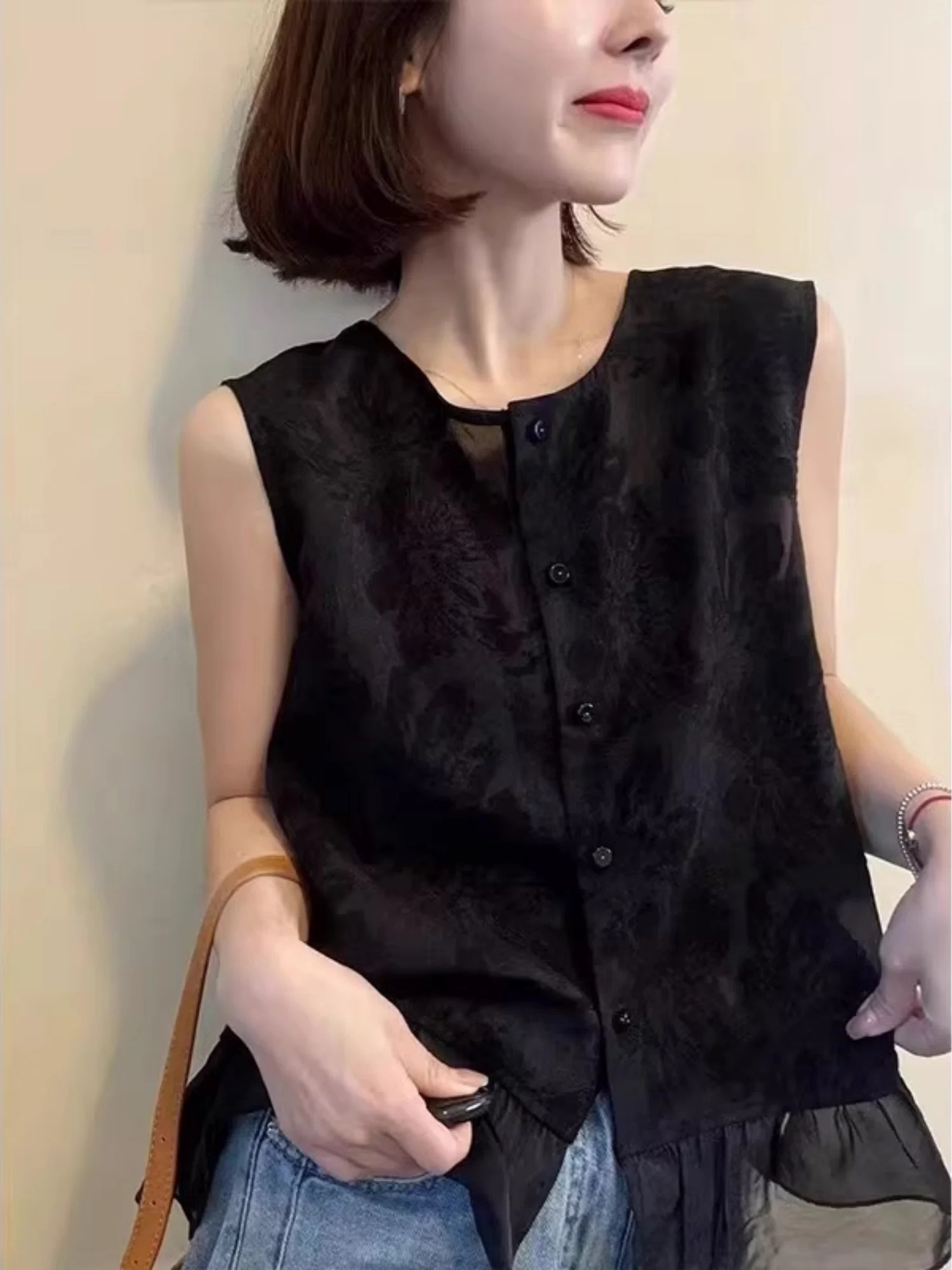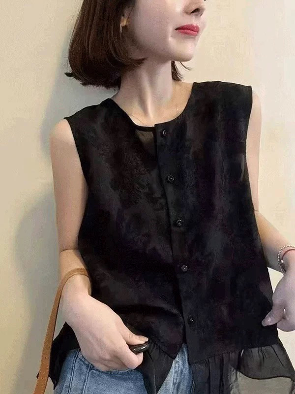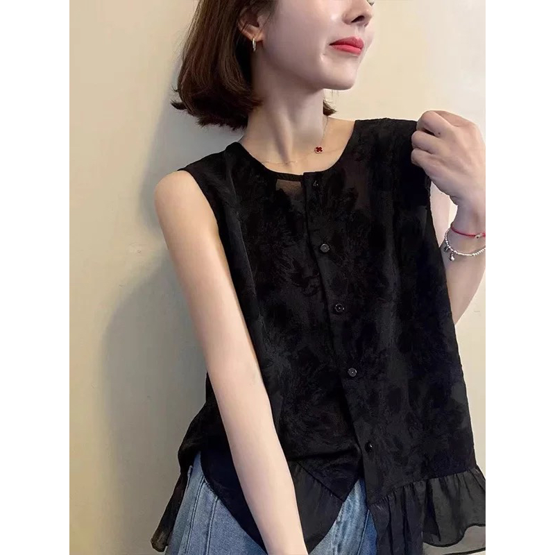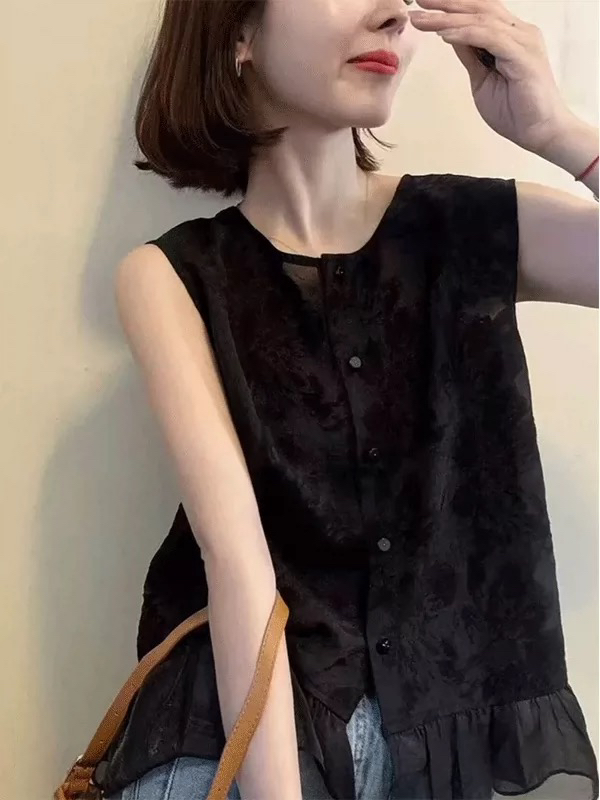 유럽 역 검정색 라운드 넥 자카드 민소매 프릴 작은 셔츠 2026 여름 연령 감소 다용도 출퇴근 품격 맨위