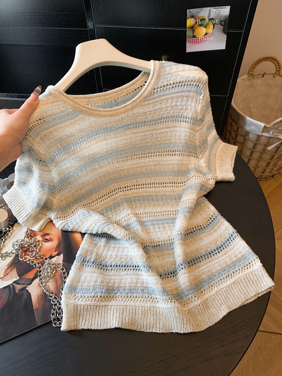 패션 외국 가스 연령 감소 오프숄더 반팔 니트 스웨터 여성 여름 루즈핏 슬림해 보이는 디자인 센스 작은 대중 스트라이프 맨위