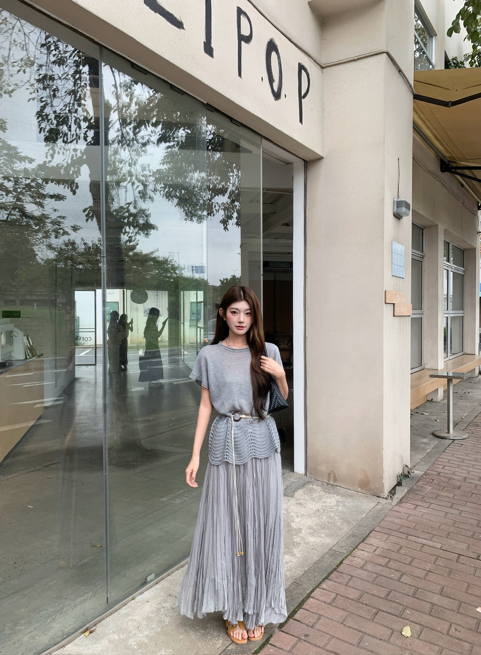 정가 실사 홀로우 아웃 물결무늬 곡물 니트 반팔 맨위 불규칙 플리츠 반신 스커트 고급 회색 세트