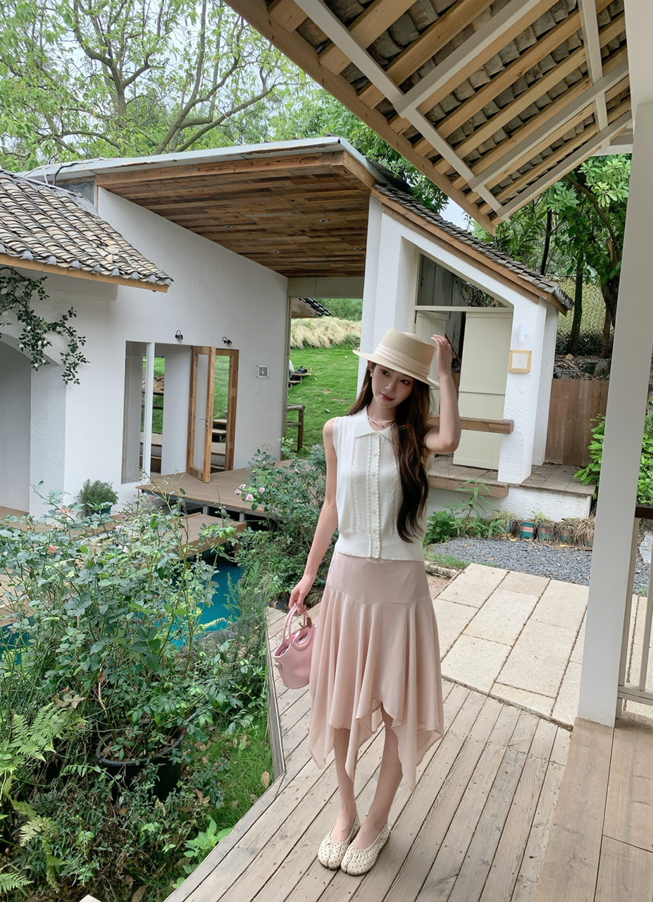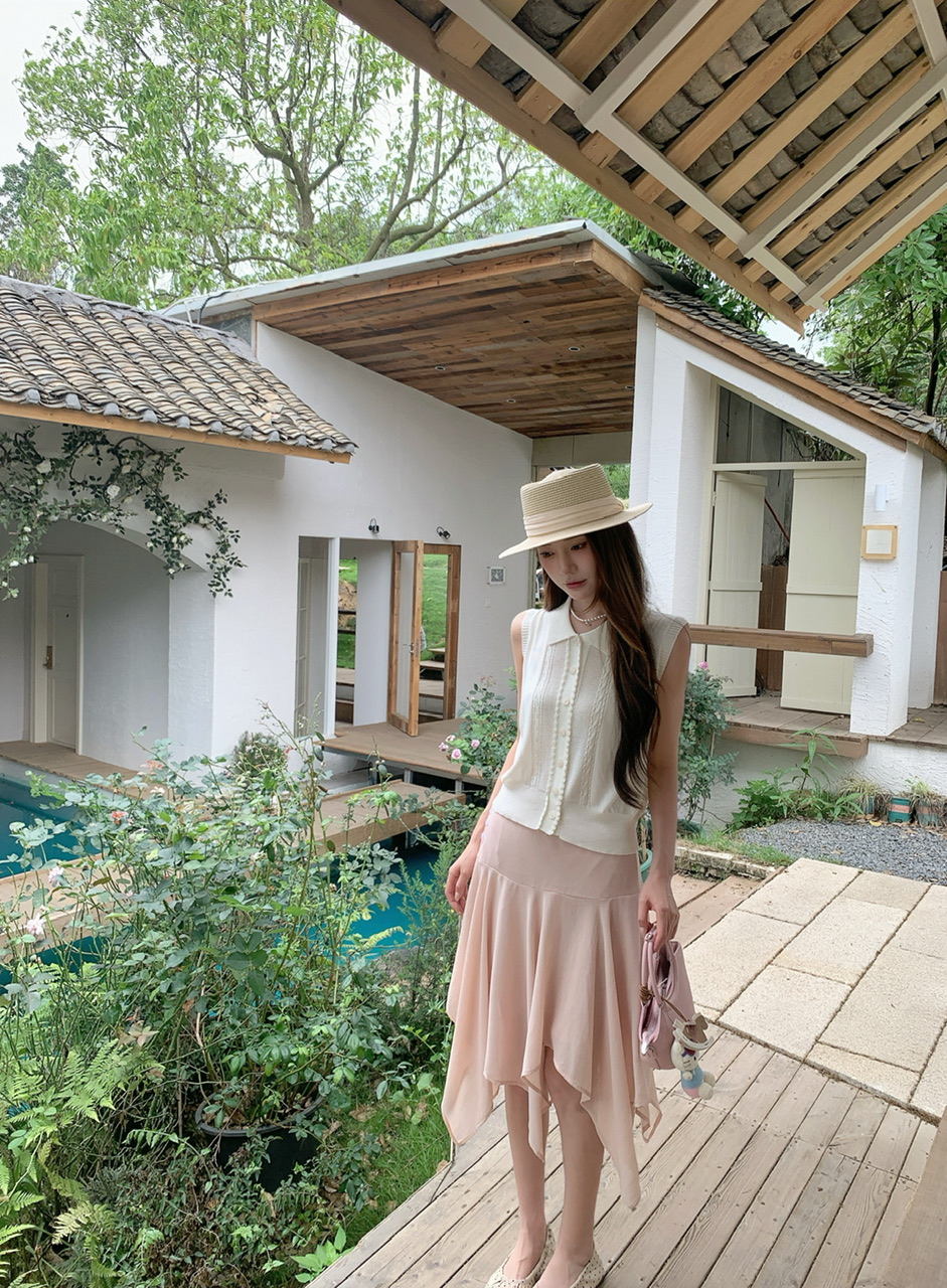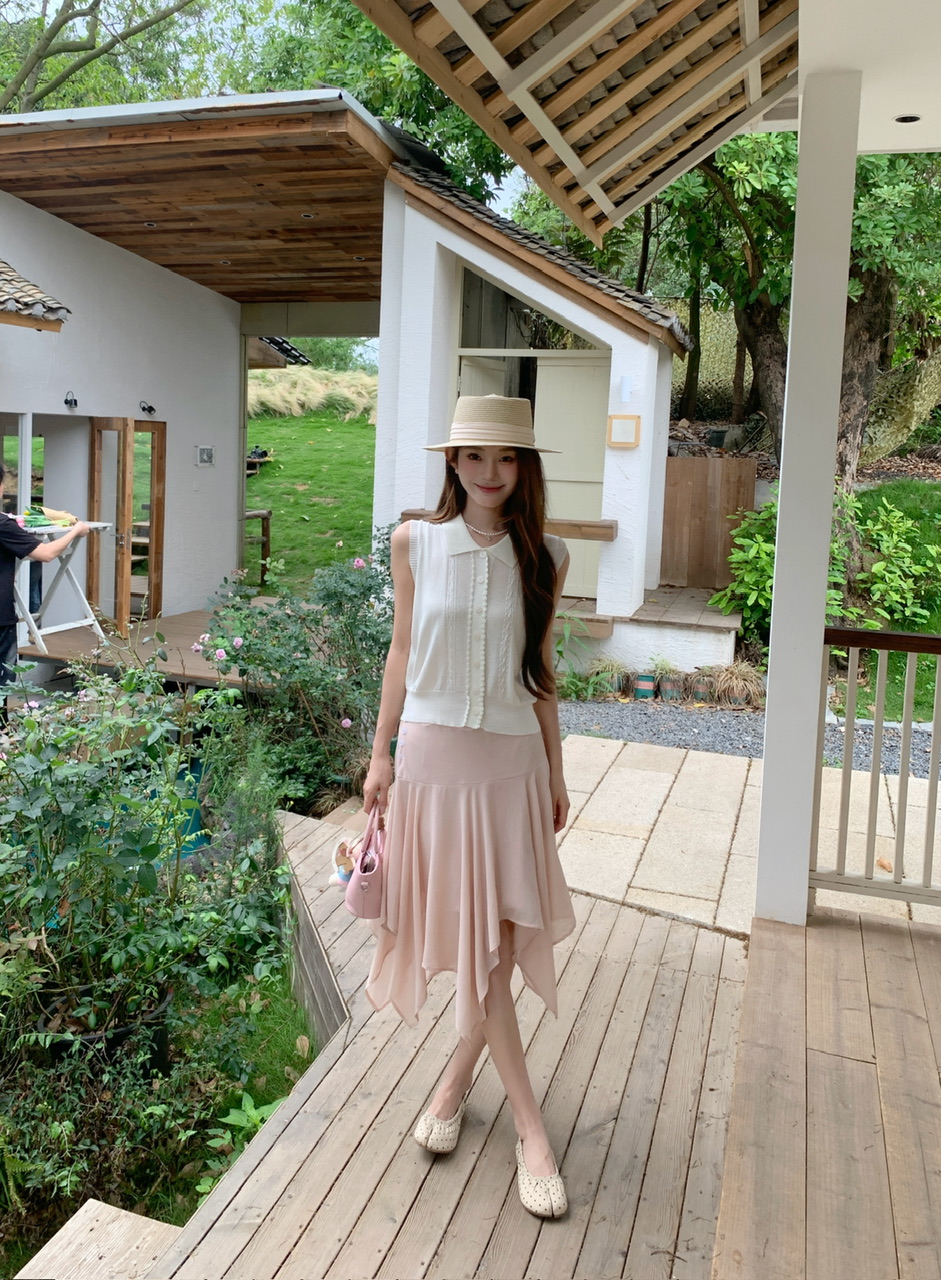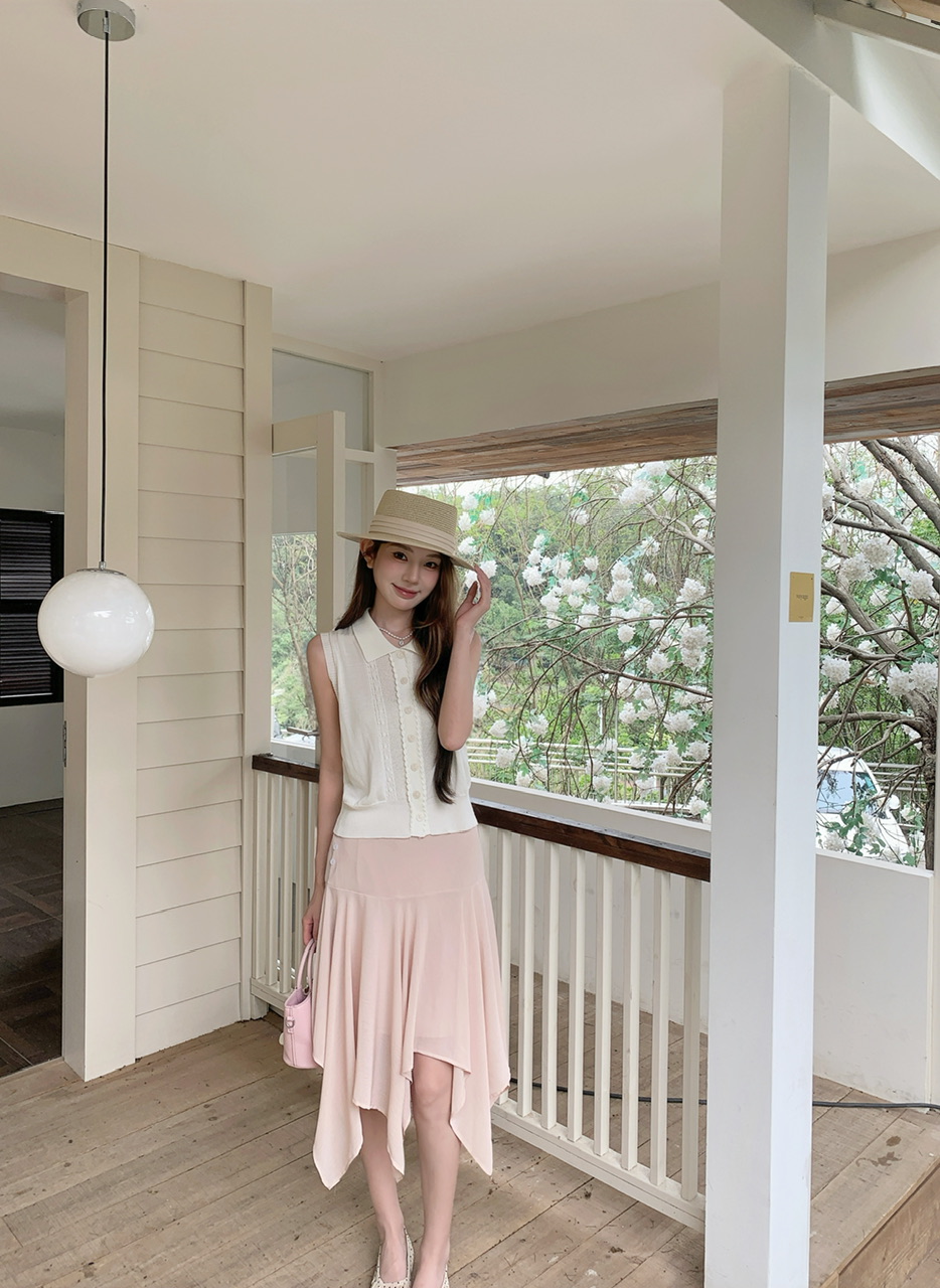 정가 실사 한 부서 여성 주님 착용 가져 가라. 살구 색상 POLO 칼라 니트 베스트 핑크색 한 마디 반 스커트 연령 감소 세트