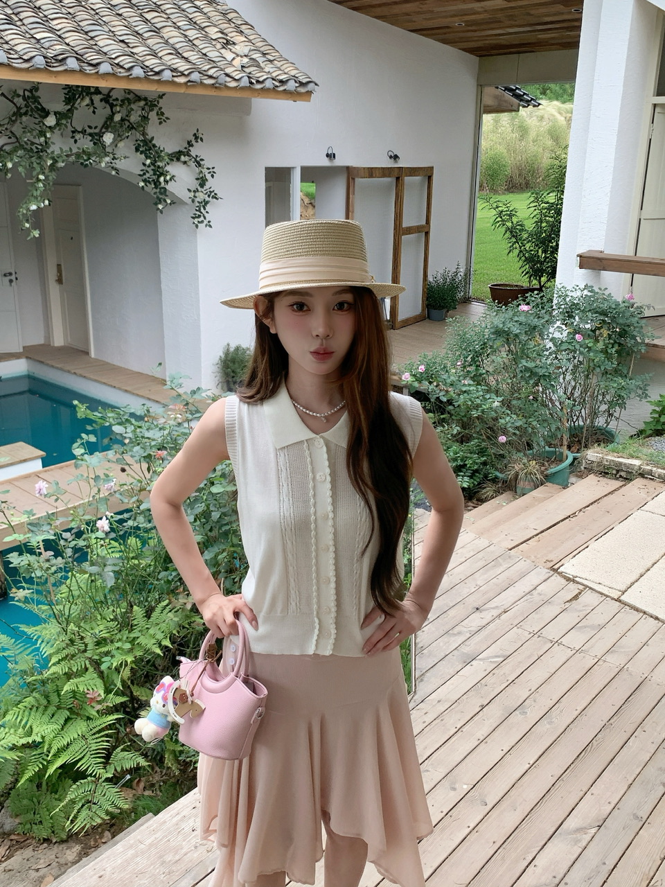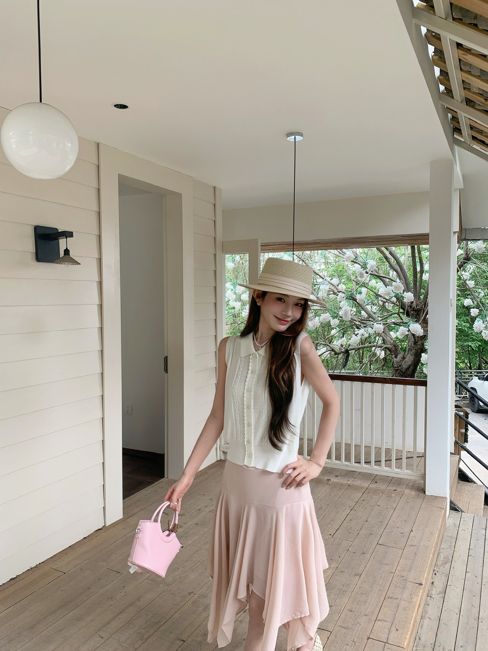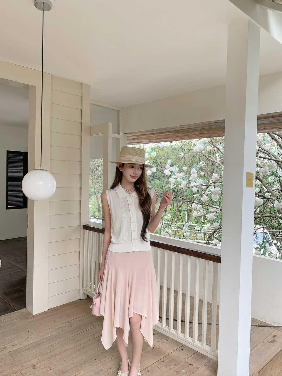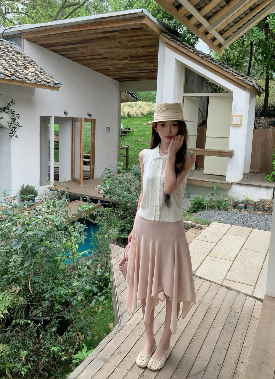 정가 실사 분위기 센스 우유 살구 얇은 스타일 니트 맨위 라이트 핑크 하이웨이스트 망사 반신 스커트 표지 고기 세트