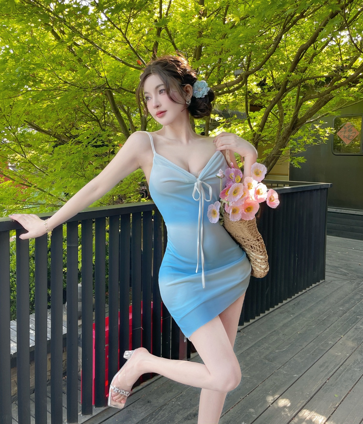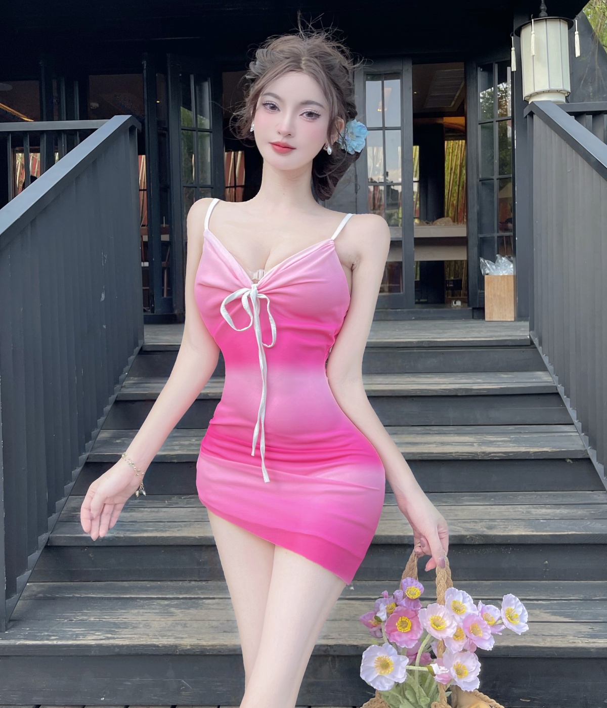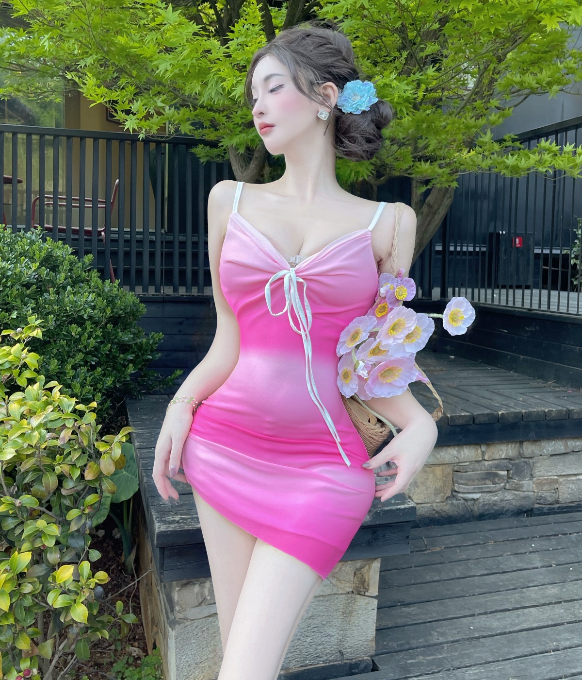 실사 3 차원 꽃 숄더백 드레스 여자 허리 수축 슬림해 보이는 a 단어 진자 순수한 욕망 바람 쇼트 스타일 치마