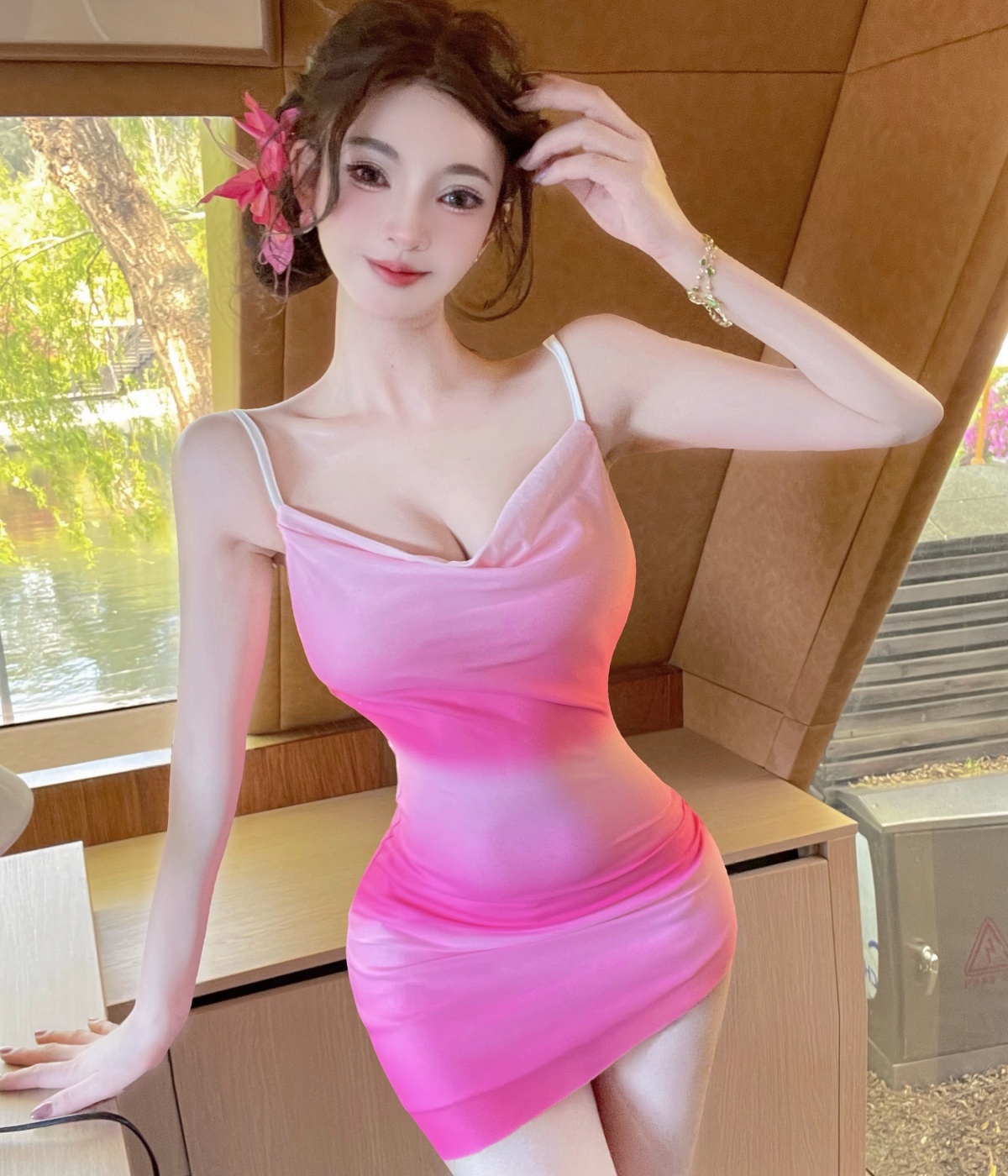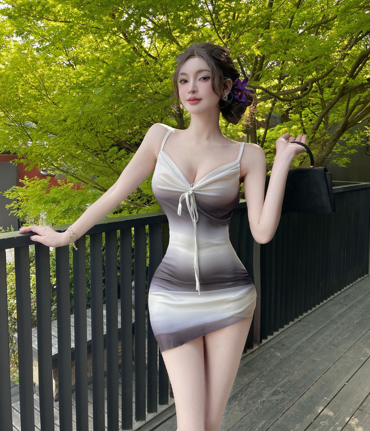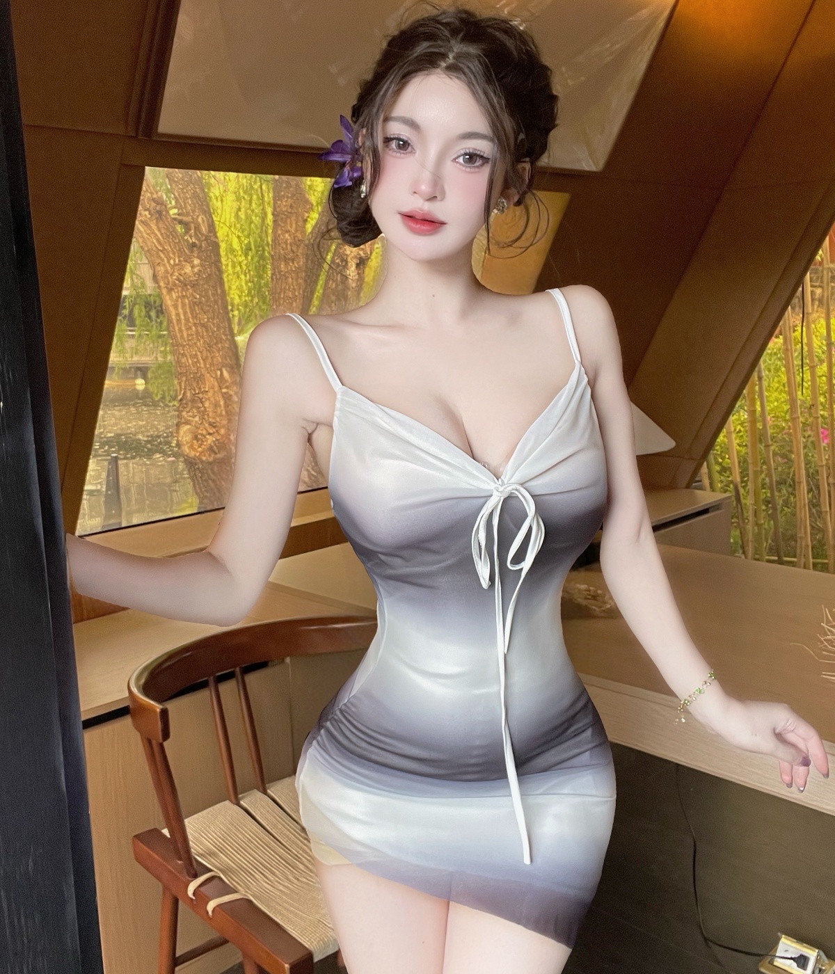 실사 순수한 욕망 섹시함 낮은 가슴 배색 쇼트 스타일 타이트 스커트 드레스 복장 슬립