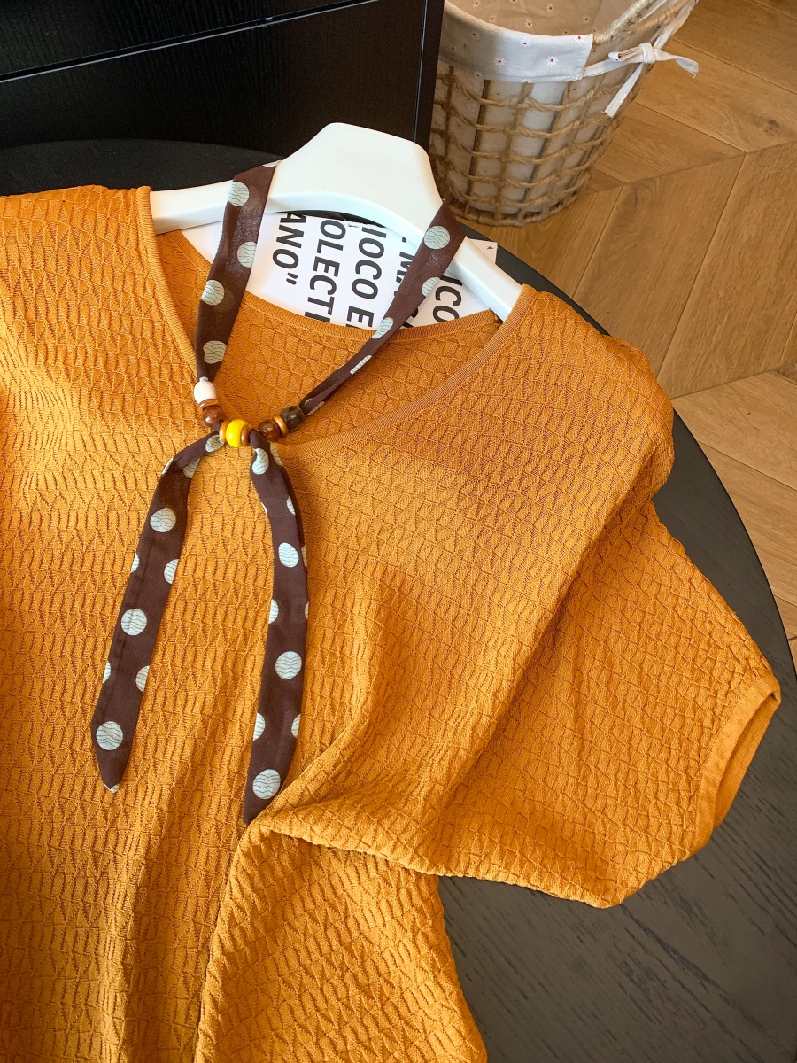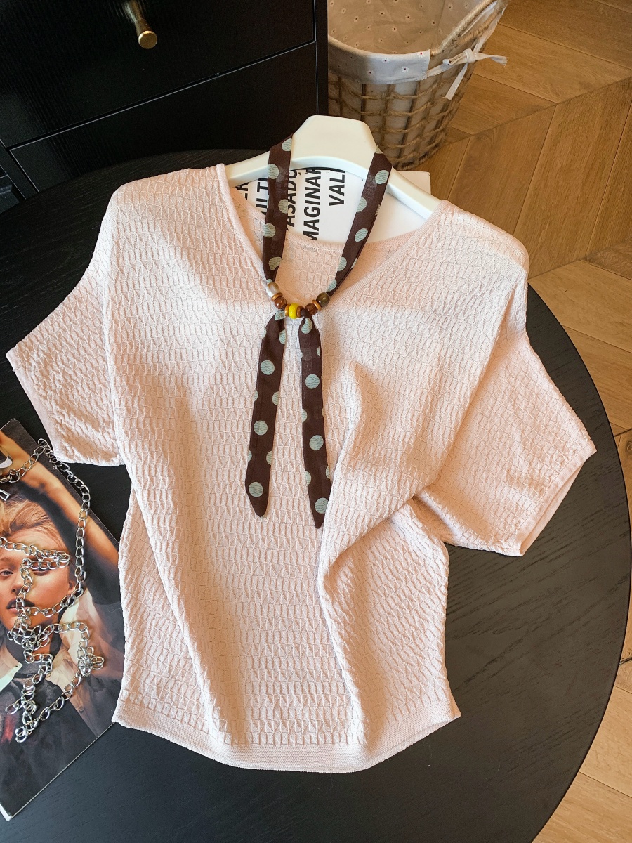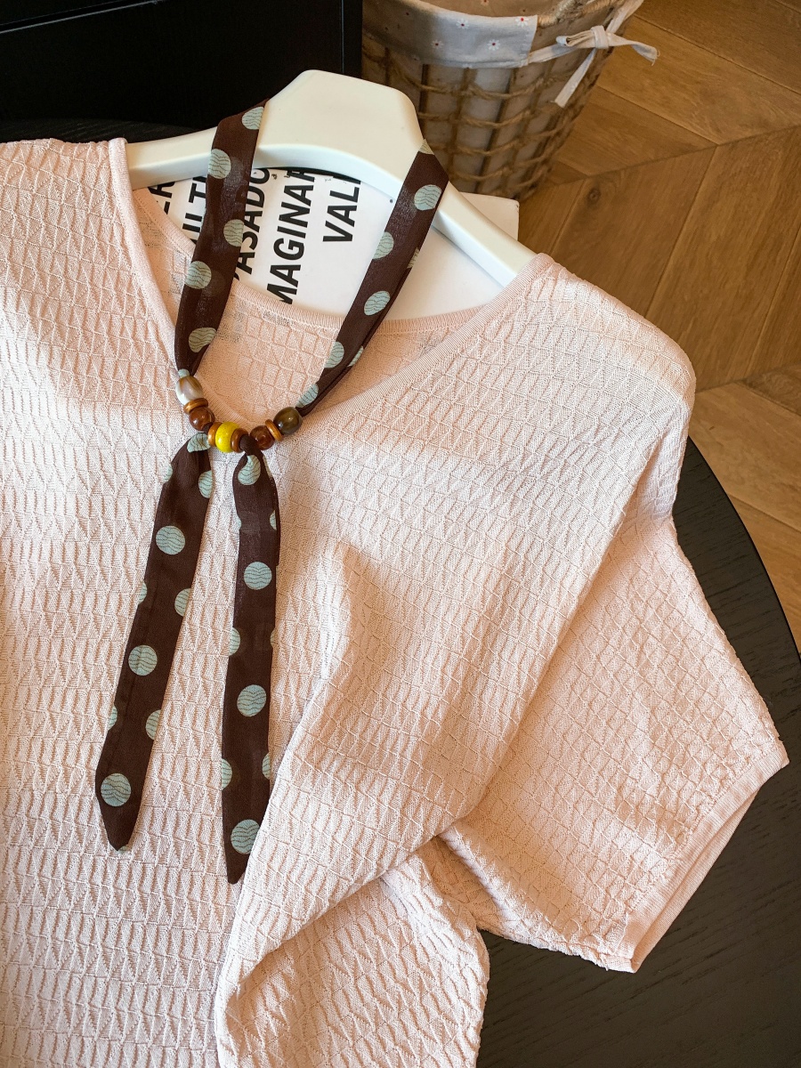 빛 요리 한 바람 V넥 반팔 니트 스웨터 여성 여름 얇은 스타일 스카프 장식 루즈핏 통기성 다용도 슬림해 보이는 티셔츠 맨위