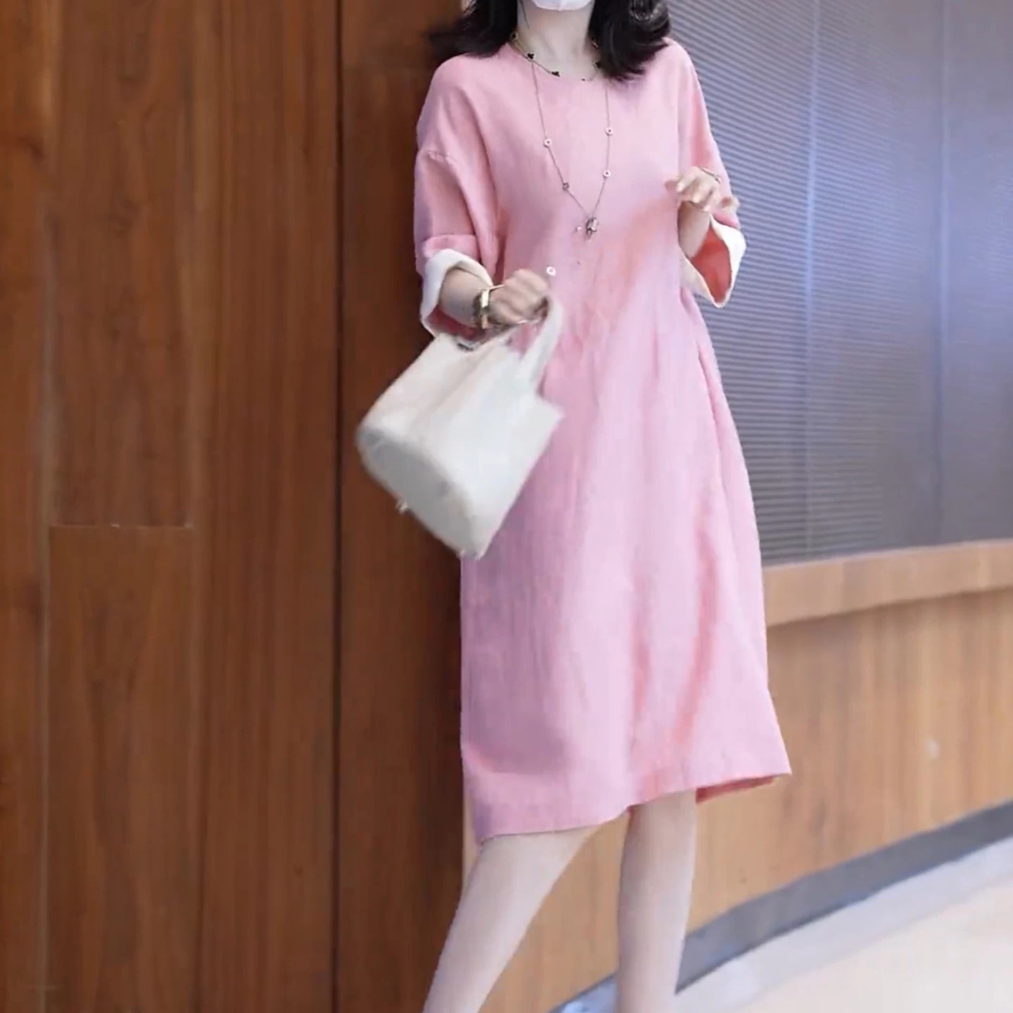 3921 커프스 배색 패치워크 품격 면 린넨 여성 드레스 중간 길이 여름 새로운 루즈핏 슬림해 보이는 치마