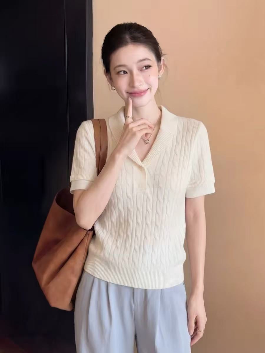 화이트 POLO 칼라 니트 반팔 여성 2026 새로운 여름 배색 구덩이 기사 슬림해 보이는 품격 다용도 쇼트 스타일 맨위