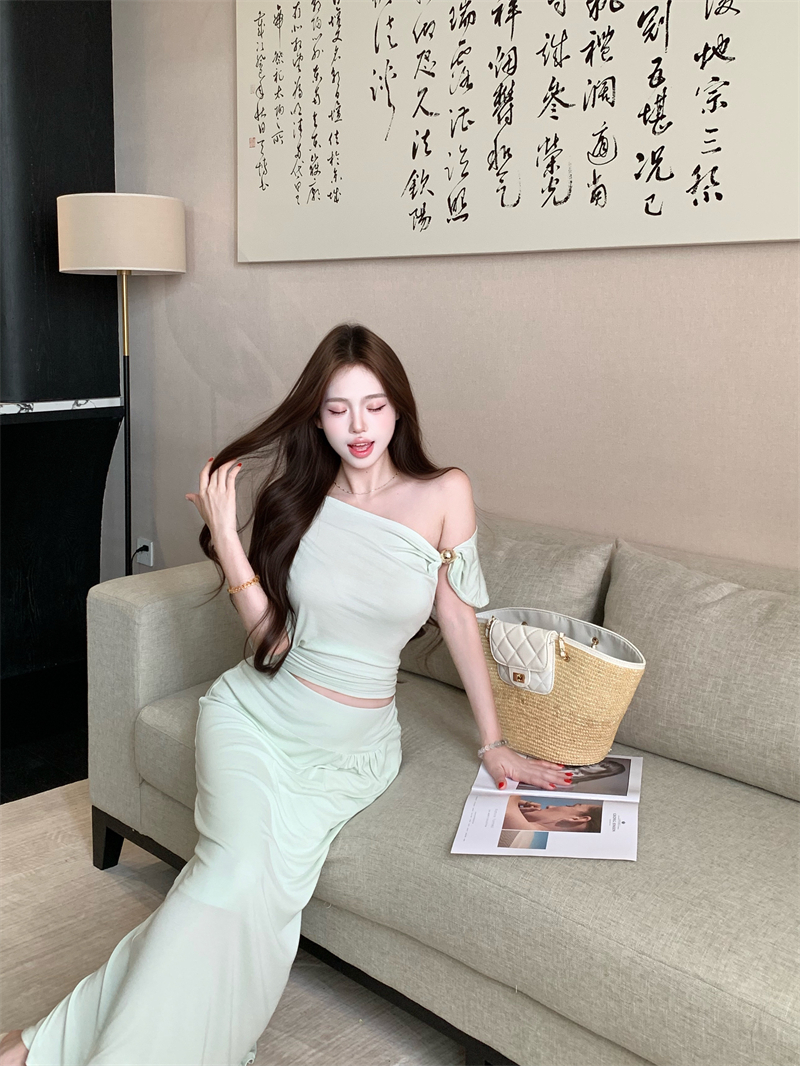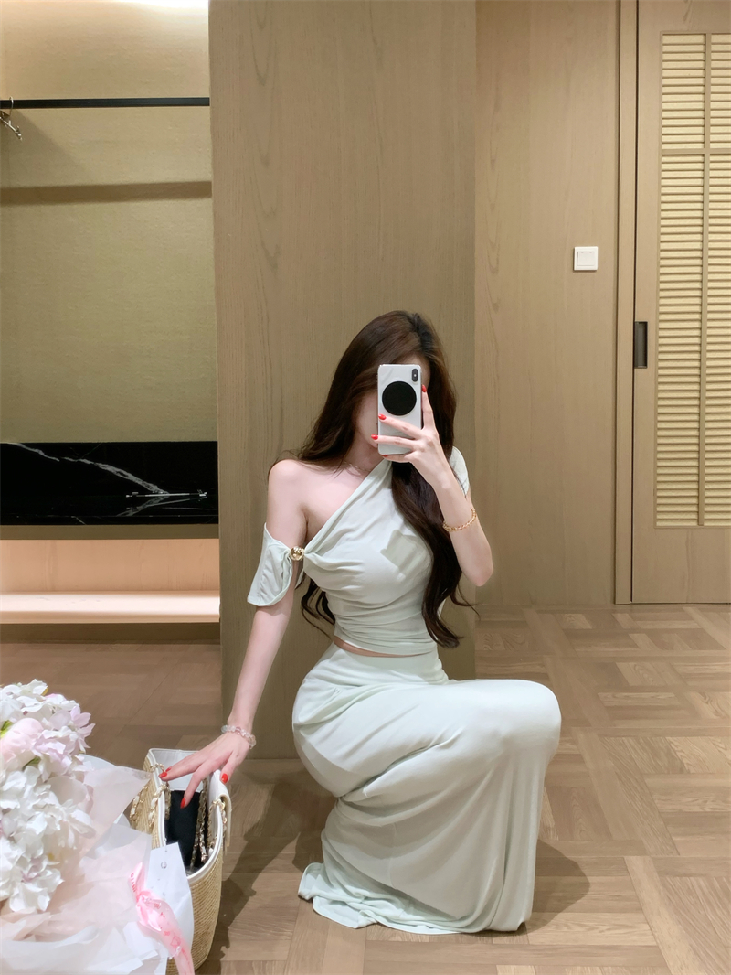 실사 정가 파란색 비스듬한 어깨 여성 드레스 섹시함 주름 허리 수축 몸매 가꾸기 타이트 스커트