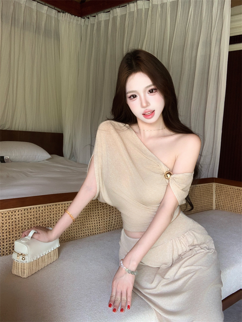 실사 정가 비스듬한 어깨 의류 티셔츠 여성용 짧은 소매 2025 새로운 오프숄더 쇼트 스타일 디자인 센스 순수한 욕망 핫걸 슬림해 보이는