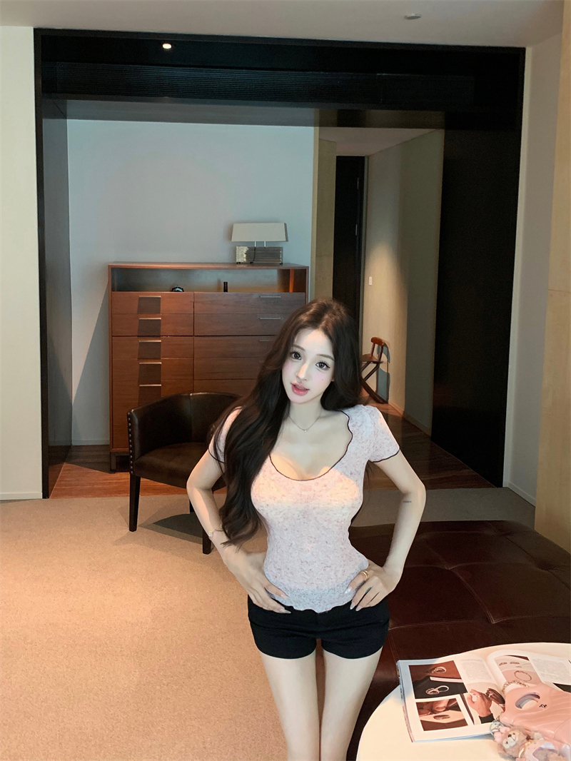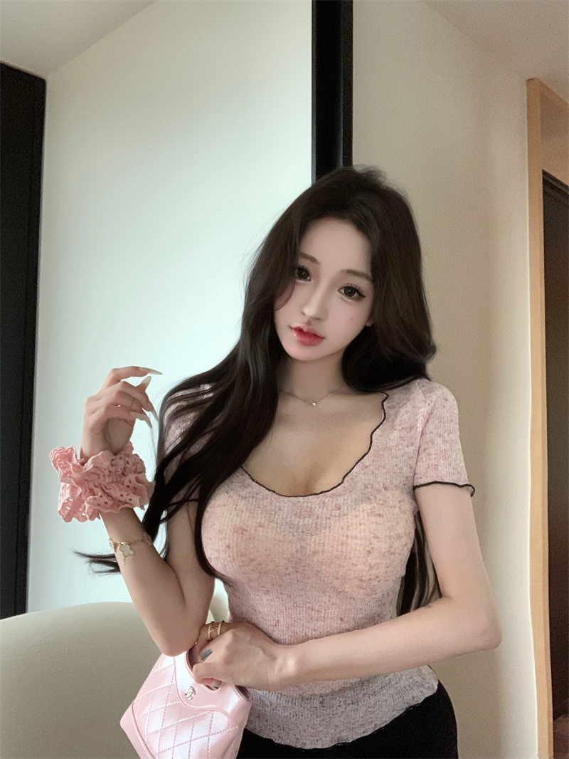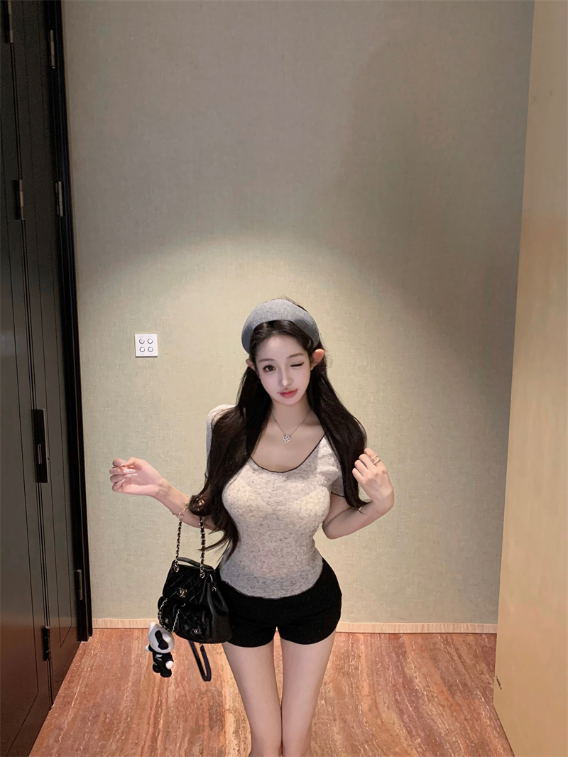 실사 정가 비스듬한 어깨 의류 티셔츠 여성용 짧은 소매 2025 새로운 오프숄더 쇼트 스타일 디자인 센스 순수한 욕망 핫걸 슬림해 보이는