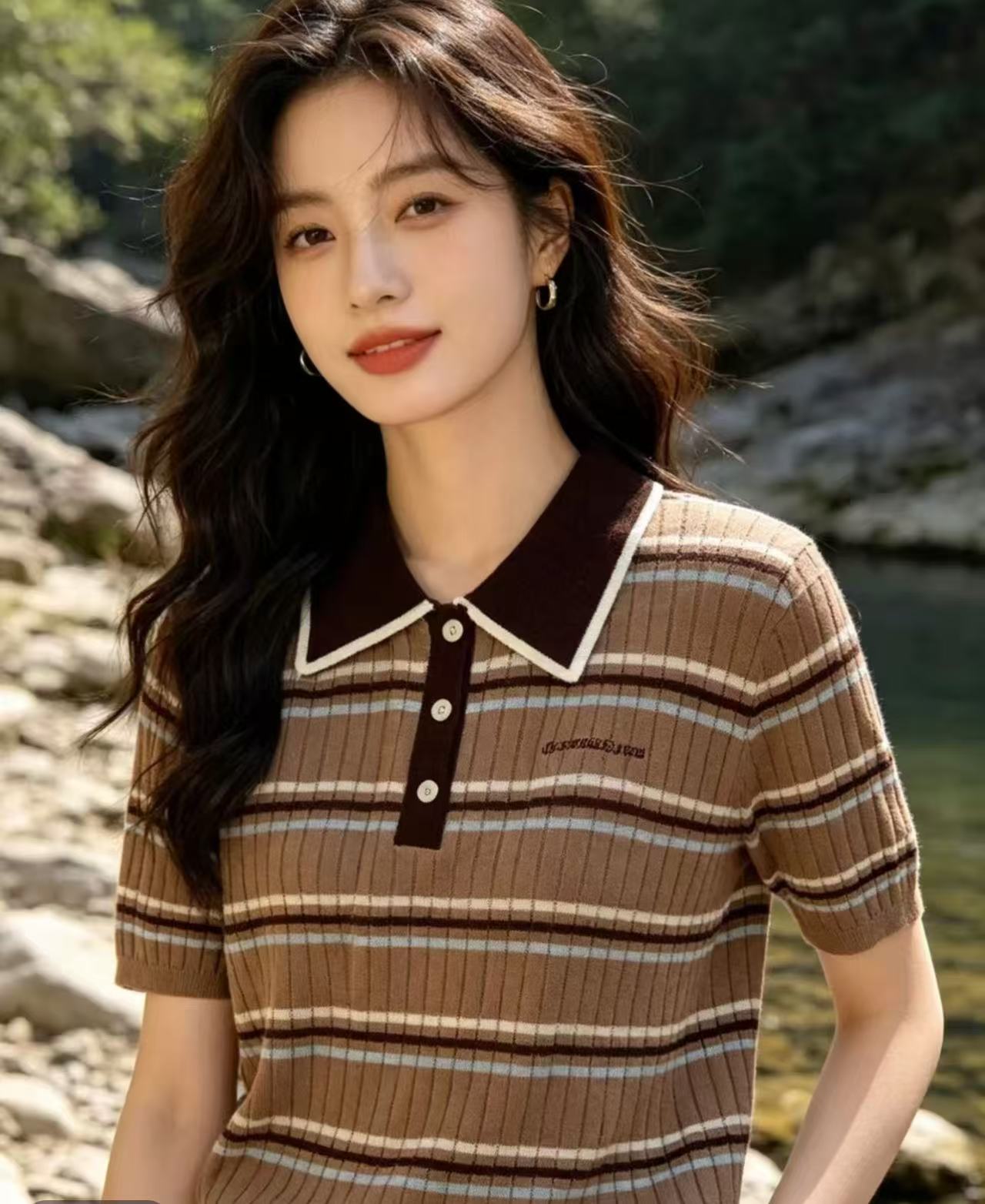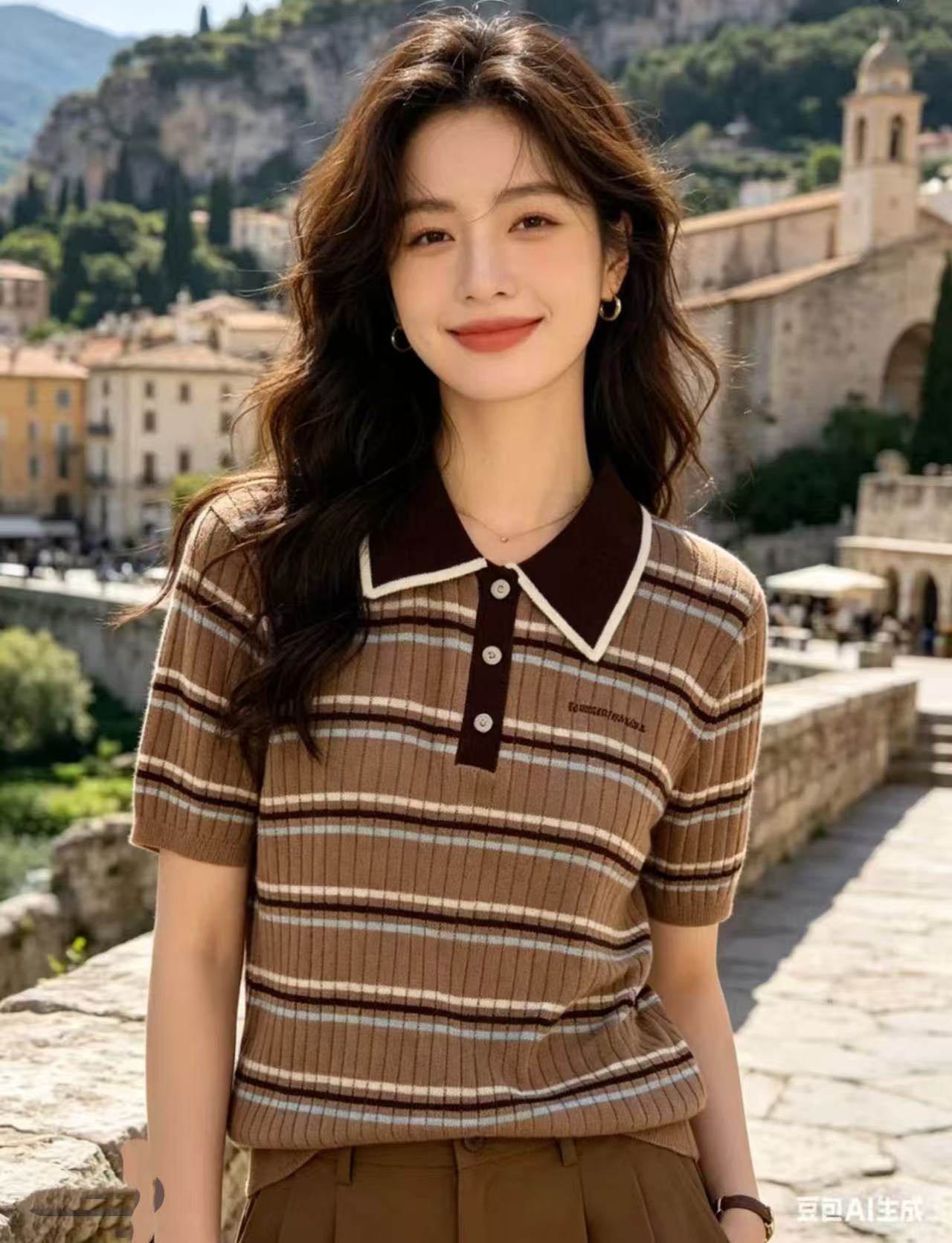 도파민 고유 한 아름다운 반팔 티셔츠 여성 2026 새로운 여름 폴로 칼라 스트라이프 니트 작은 셔츠 아름다운 맨위