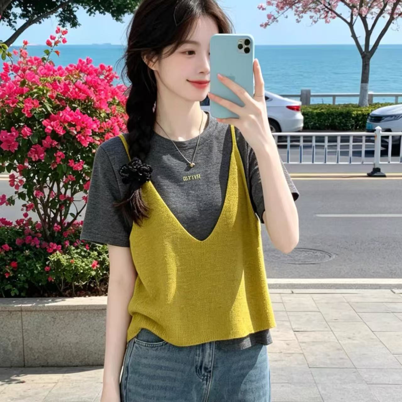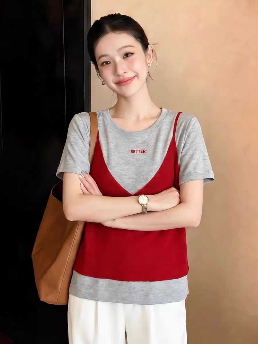 여름 새로운 디자인 센스 페이크 레이어드 반팔 티셔츠 여성 올해 인기 폭발 고급 센스 패션 다용도 맨위
