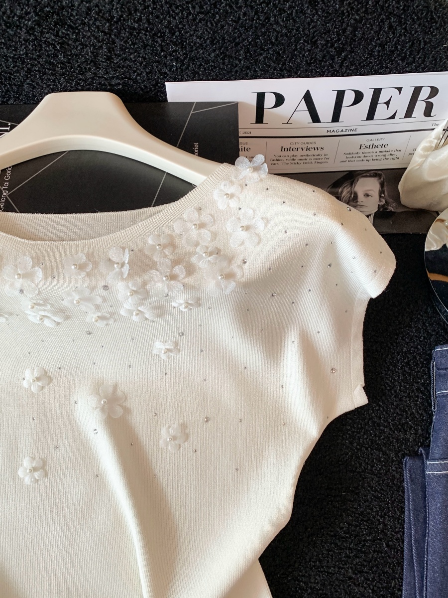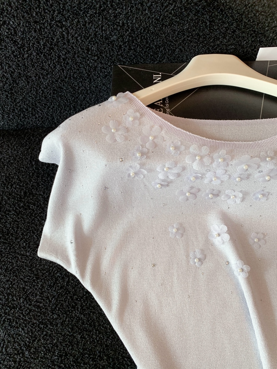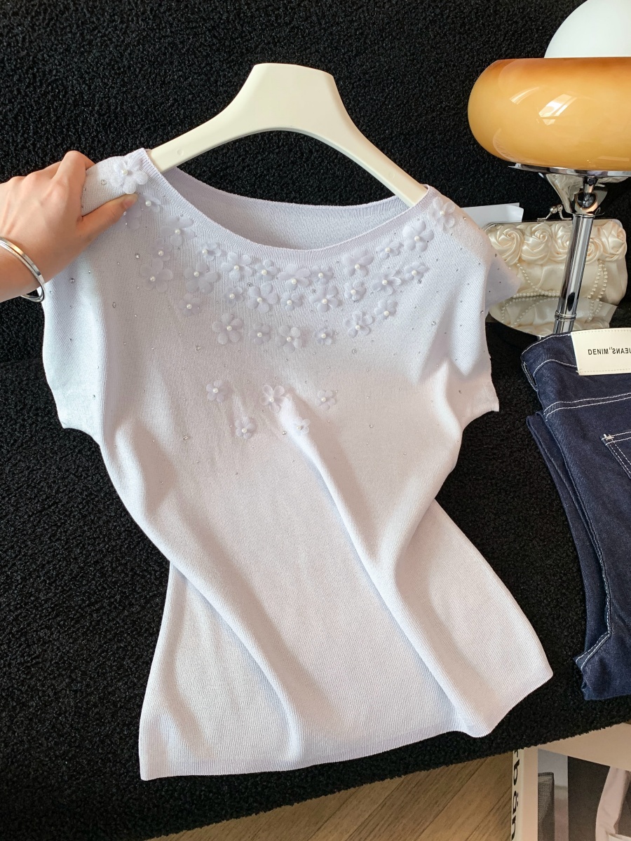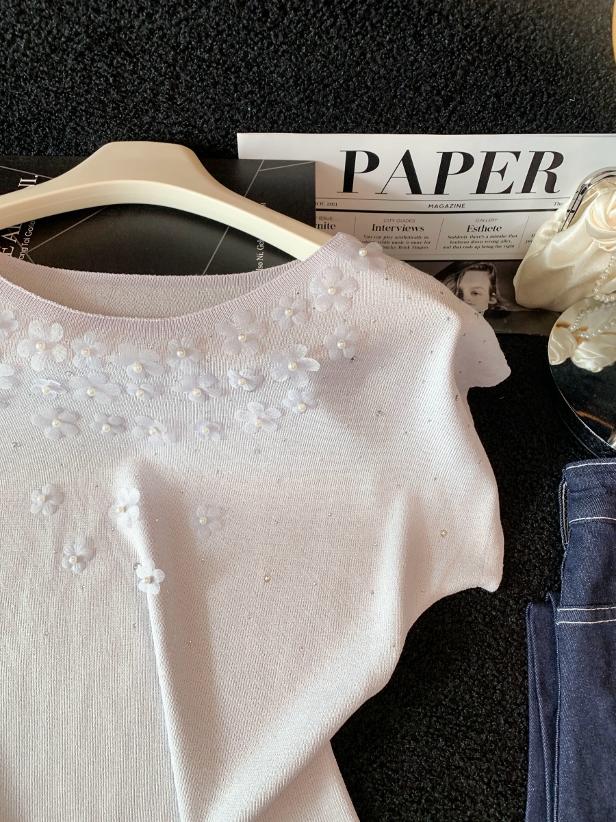 실사 2026 여름 새로운 니트 티셔츠 진주 3 차원 꽃잎 몸매 가꾸기 반팔 맨위 빛 럭셔리 고급 센스