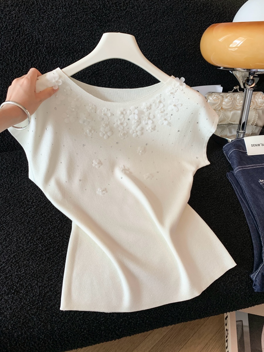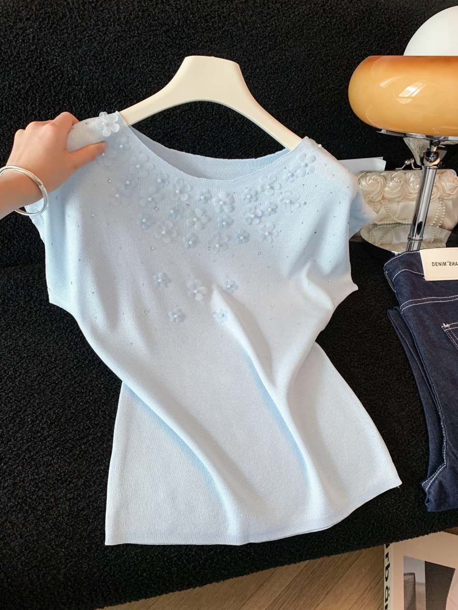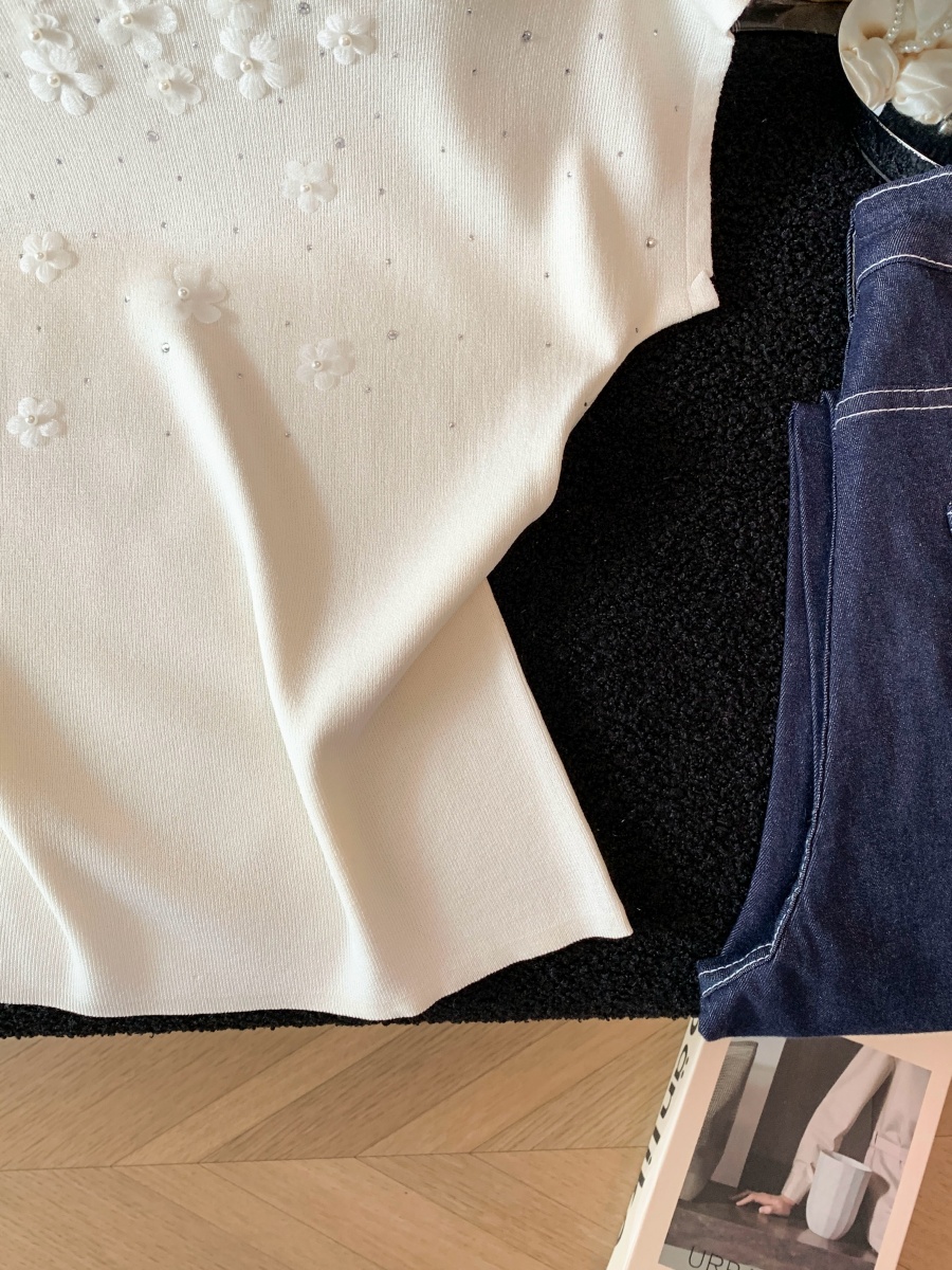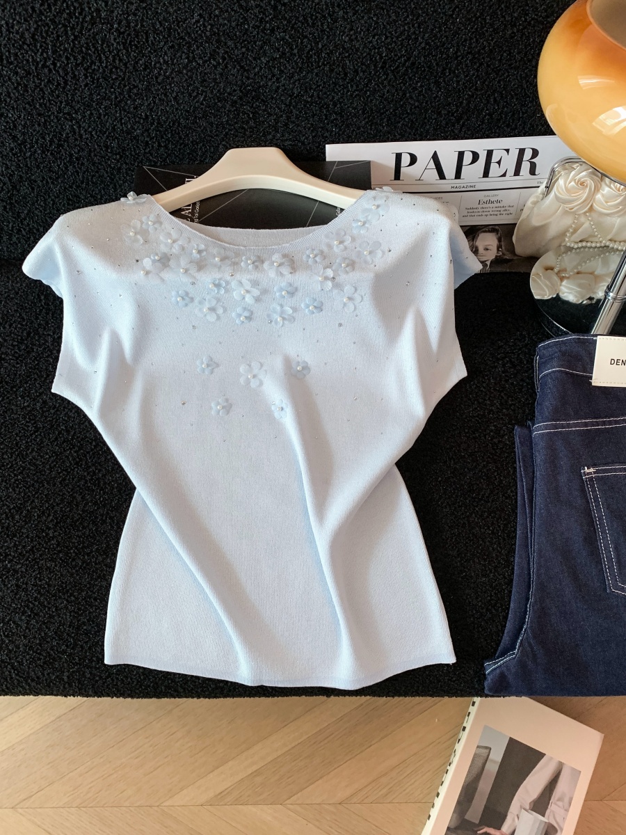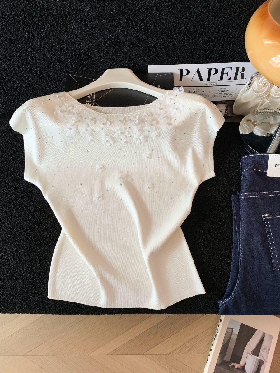 실사 2026 여름 새로운 니트 티셔츠 진주 3 차원 꽃잎 몸매 가꾸기 반팔 맨위 빛 럭셔리 고급 센스
