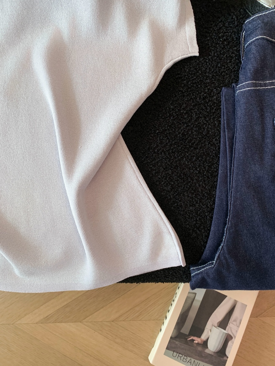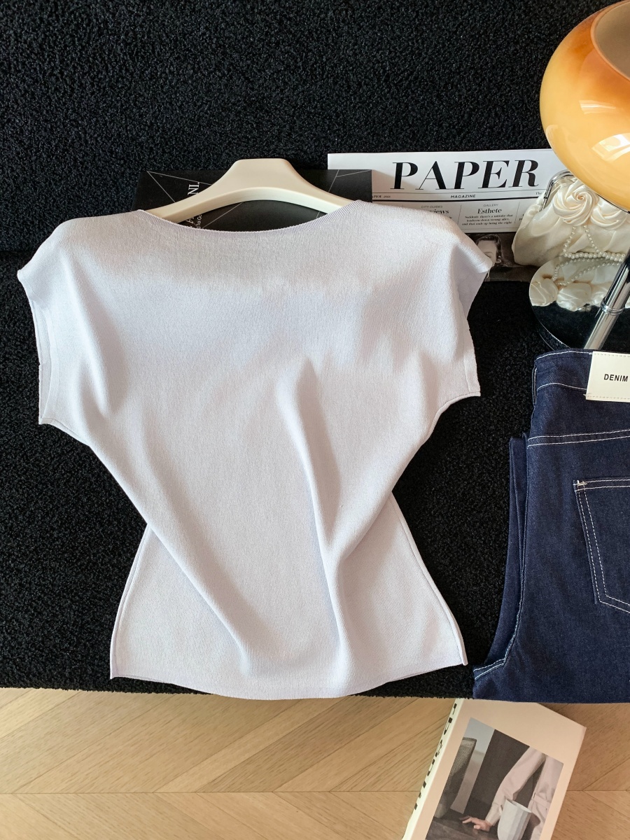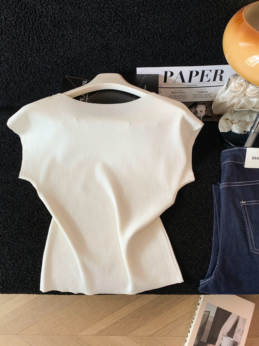 실사 프랑스식 해군 칼라 V넥 얼음 실크 니트 반팔 티셔츠 여성 여름 배색 민소매 조끼 몸매 가꾸기 숄 맨위