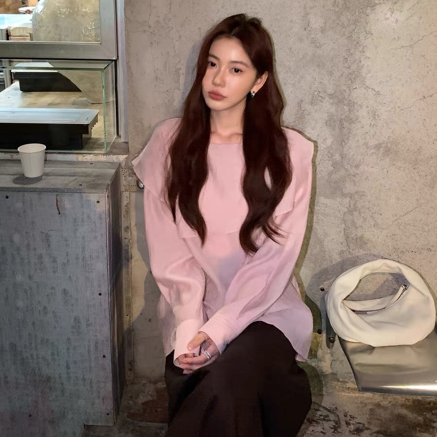 halo luu 핑크색 쉬폰 여성 셔츠 봄 여름 새로운 불규칙 맨위 루즈핏 캐주얼 프릴 칼라 셔츠
