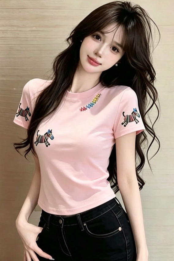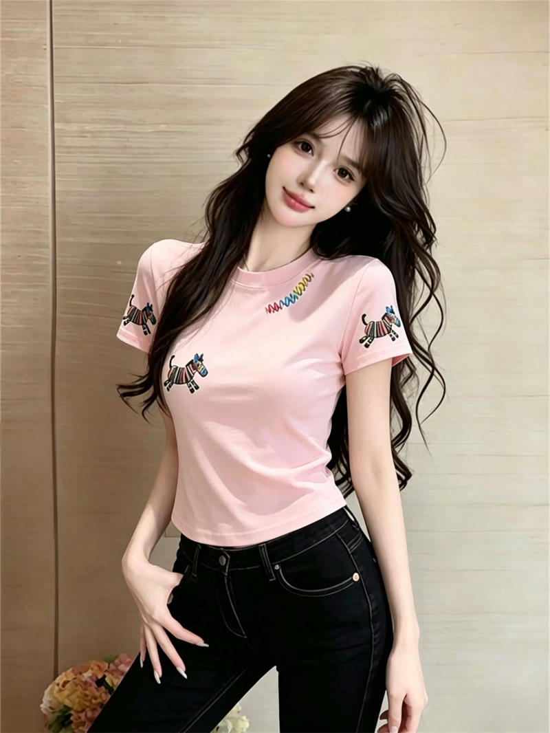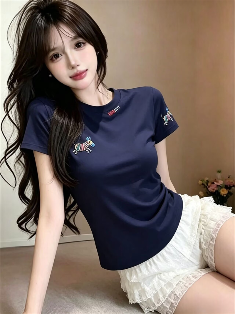 실사 한국 스타일 색상 작은 말 자수 반팔 티셔츠 여성 2026 년 새로운 라운드 넥 몸매 가꾸기 슬림해 보이는 다용도 맨위