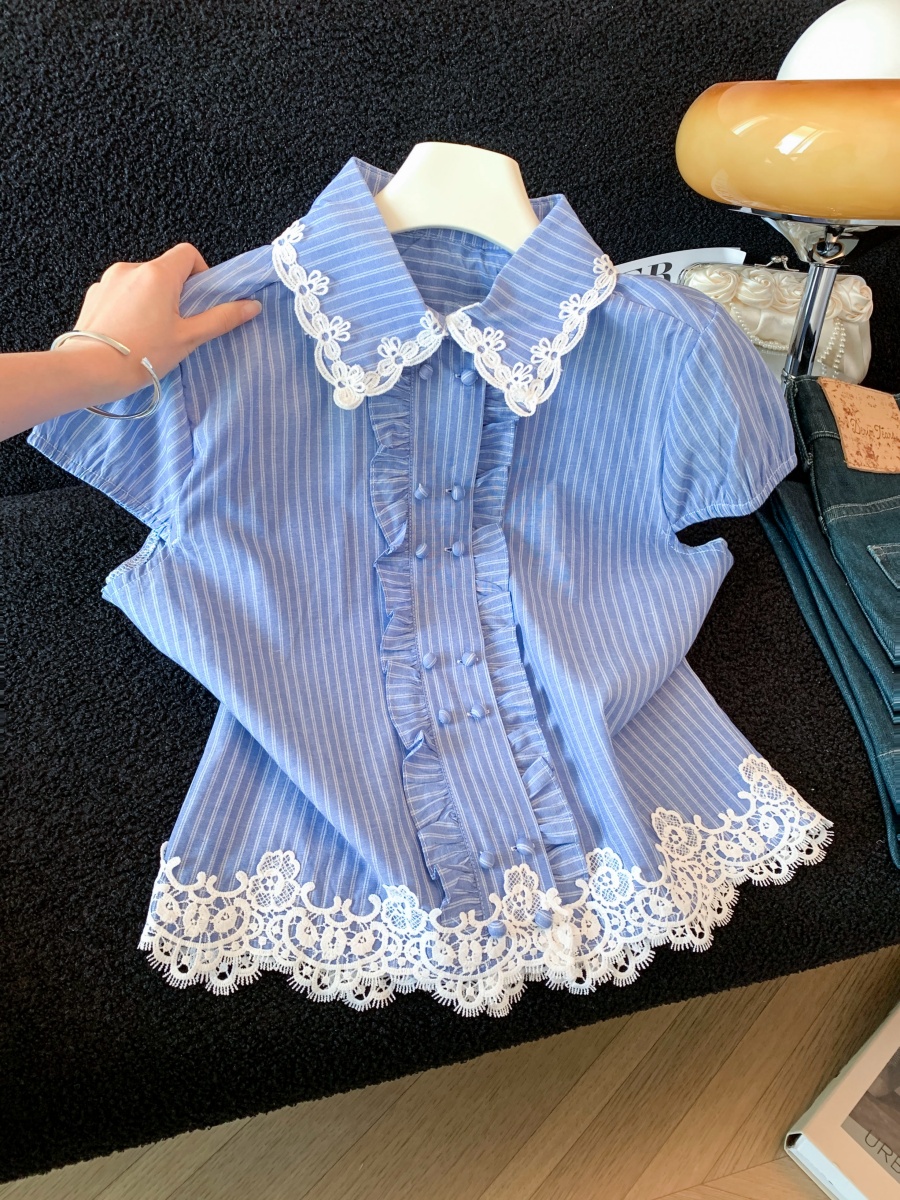 실사 작은 청신 프랑스식 패치워크 프릴 레이스 측면 이중 버튼 셔츠 여름 베이비 칼라 연령 감소 맨위