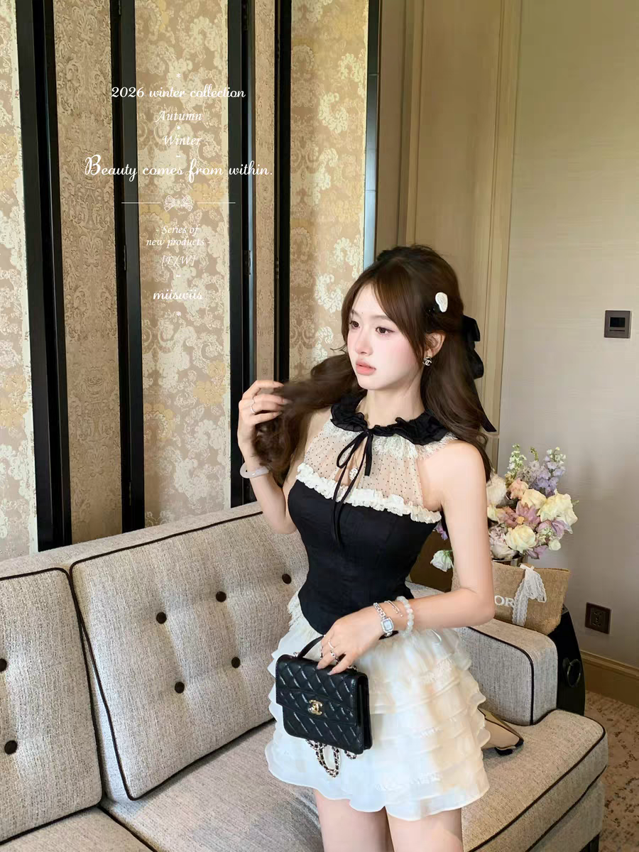 열세 개 회색 펌프 Pleat 짜임 레이스업 투피스 조끼 여성 여름 분위기 센스 얇은 스타일 망사 민소매 맨위