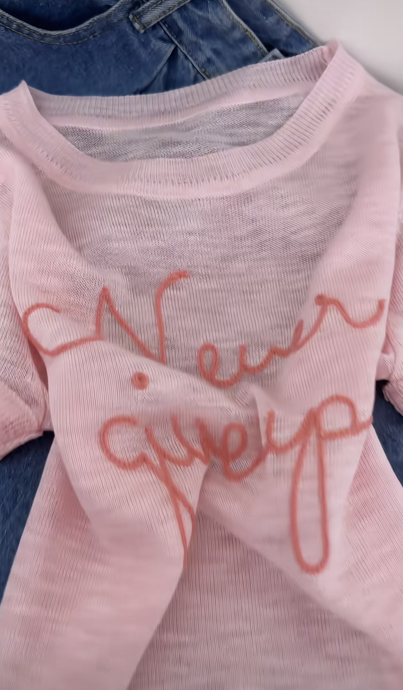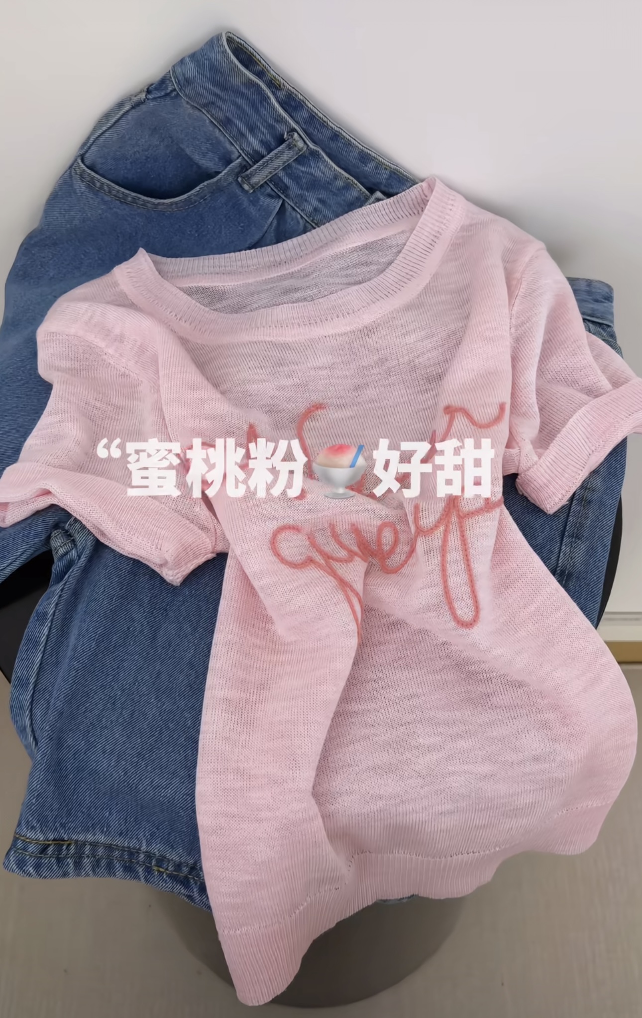 여름 슈퍼 부드러운 ~ 중 복숭아 핑크색 알파벳 자수 라운드 넥 반팔 니트 스웨터 여성 ins 맨위