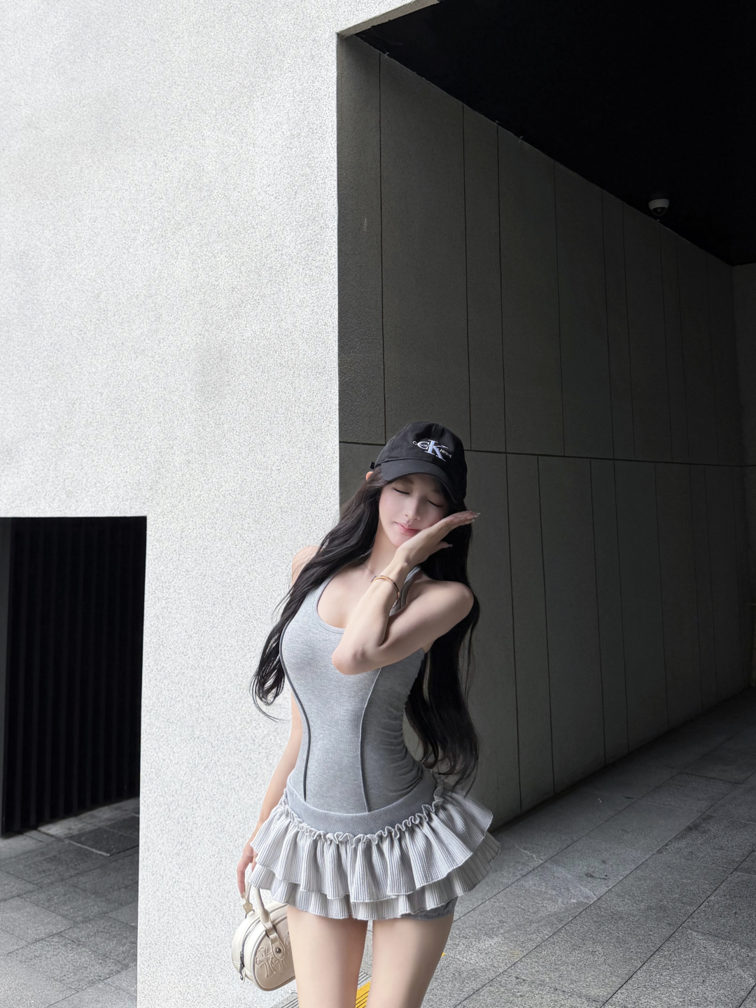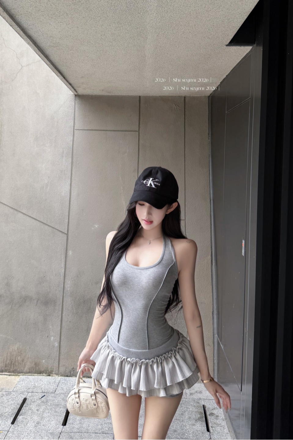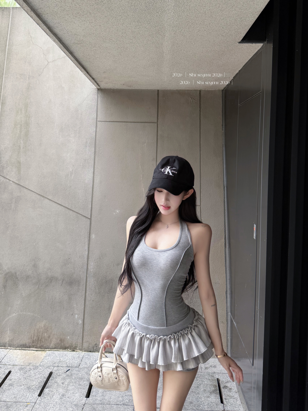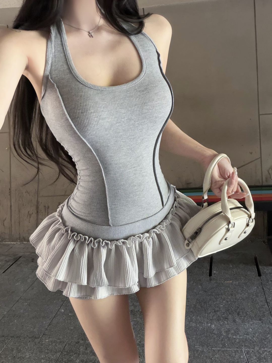 실사 정가 사설 서비스 한 여성 회색 행침 목 몸매 가꾸기 케이크 드레스 섹시함 핫걸 허리 수축 민소매 쇼트 스타일 드레스