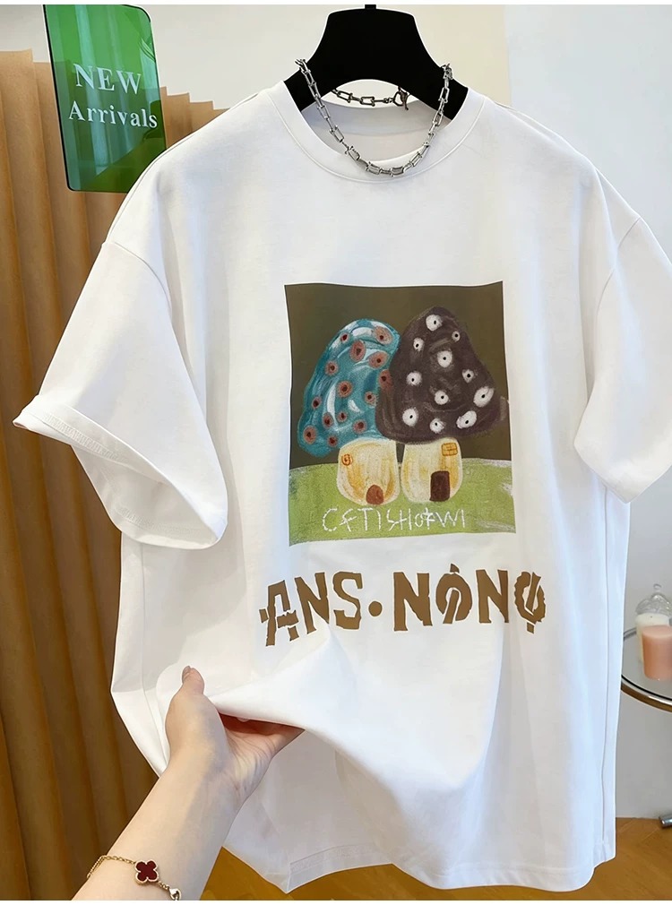 21 순면 210 그램 2026 년 봄 여름 드레스 반팔 티셔츠 여성 한국 스타일 프린트