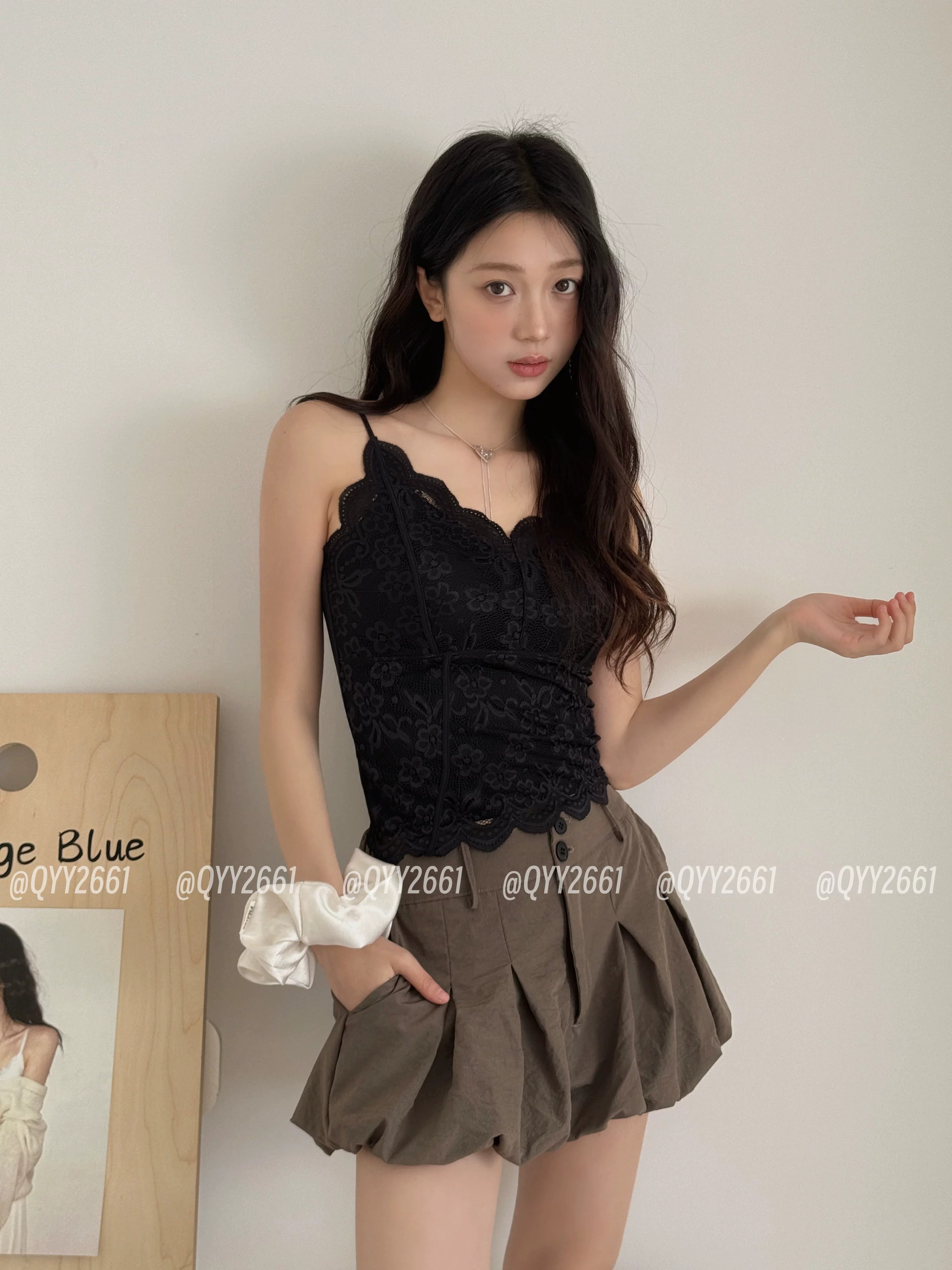 원본 한국 chic 프릴 체크무늬 쉬폰 블라우스 캐미솔 스트랩 홀로우 아웃 주름 패치워크 맨위