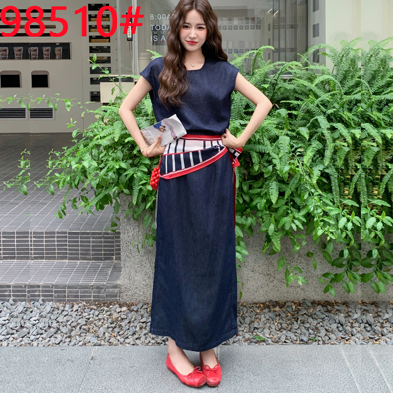 차가운 바람의 소리 패션 미니멀리즘 패치워크 주간 실크 민소매 데님 세트 여성 봄 여름 새로운 스카프 두 조각 치마 반신 스커트