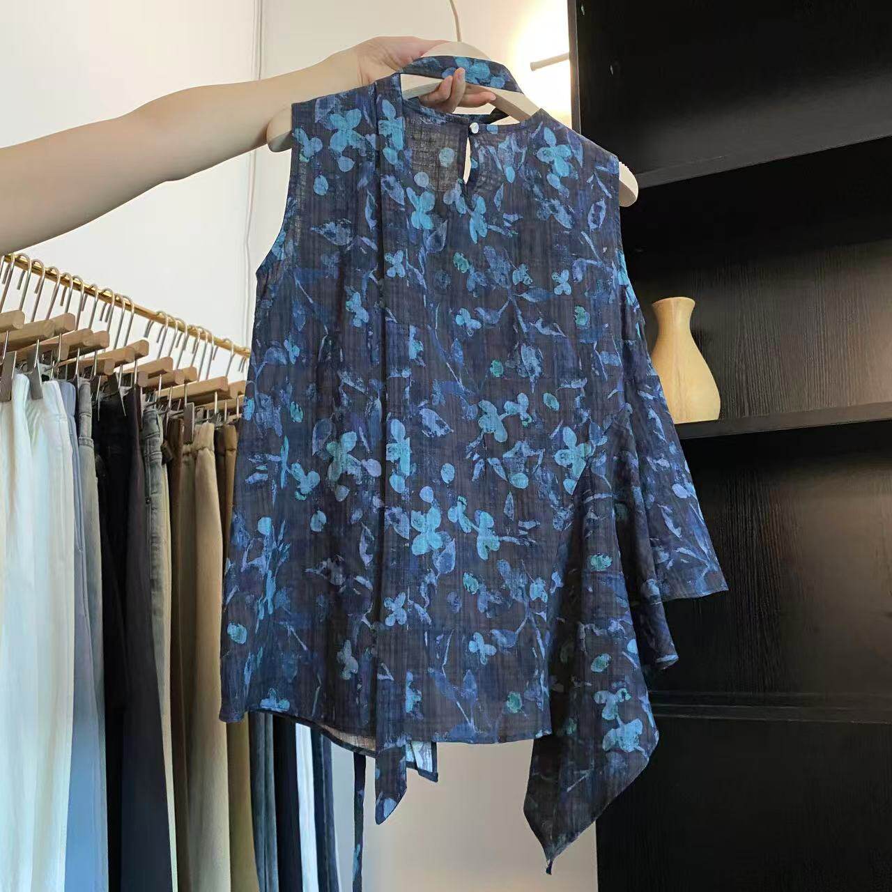 작은 청신 여성 의류 직접 만든 한국 스타일 떠 다니는 레트로 품격 불규칙 밑단 경기 리본 민소매 여성 셔츠