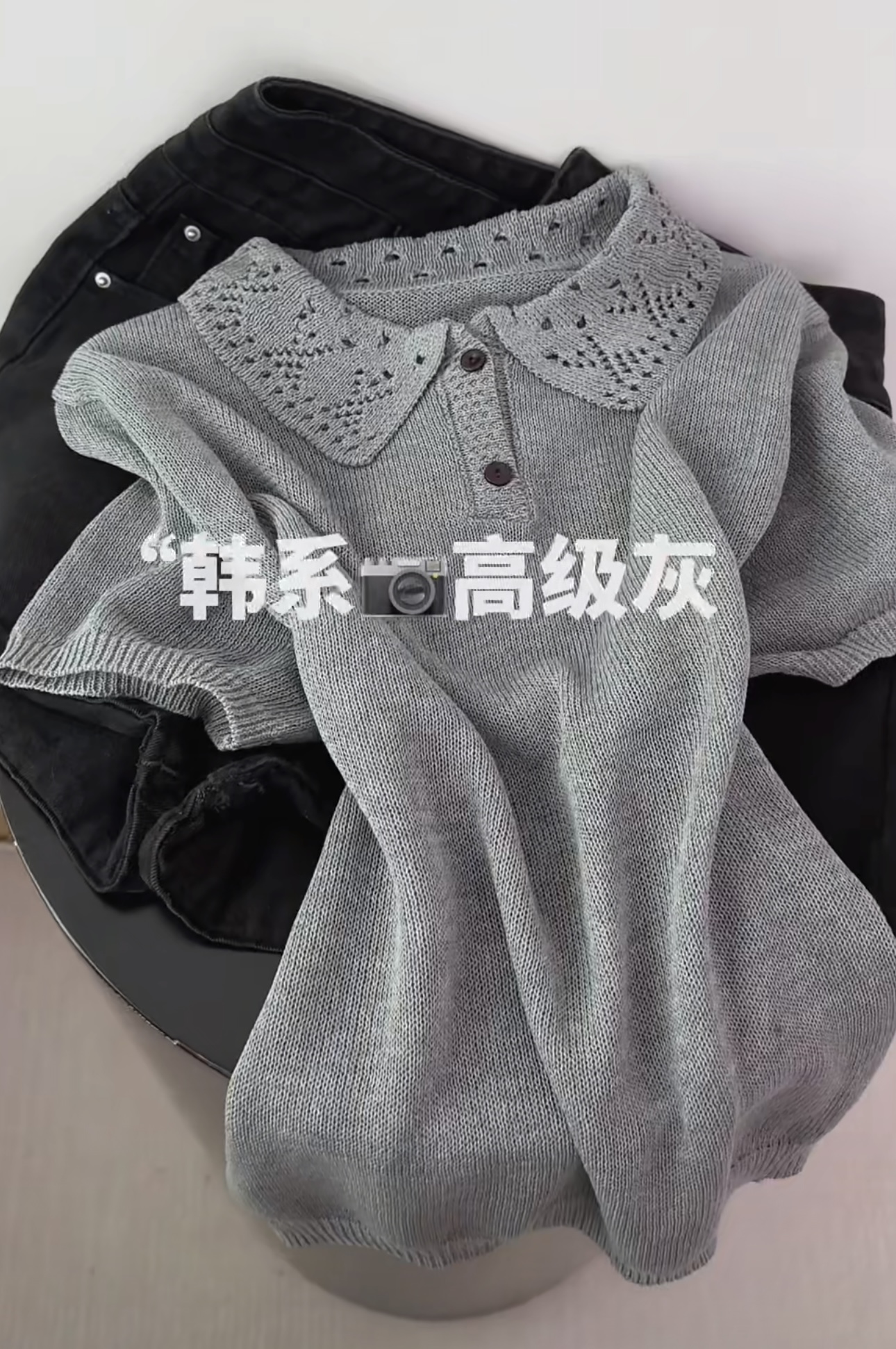유럽 상품 패션 회색 자수 홀로우 아웃 POLO 칼라 반팔 니트 스웨터 여성 루즈핏 슬림해 보이는 맨위