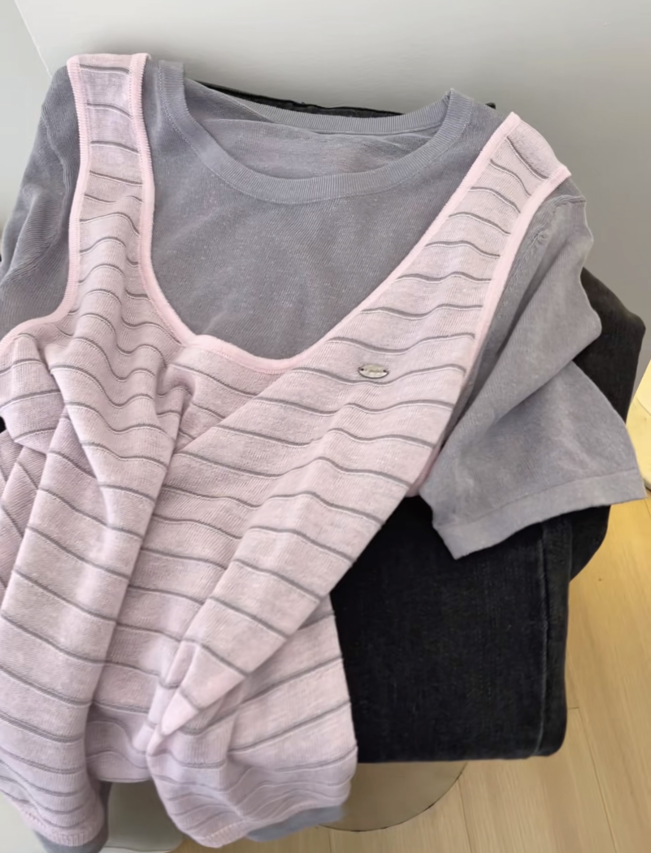 한 부서 착용 가져 가라. 배색 스트라이프 라운드 넥 반팔 니트 스웨터 여성 여름 새로운 몸매 가꾸기 슬림해 보이는 다용도 맨위