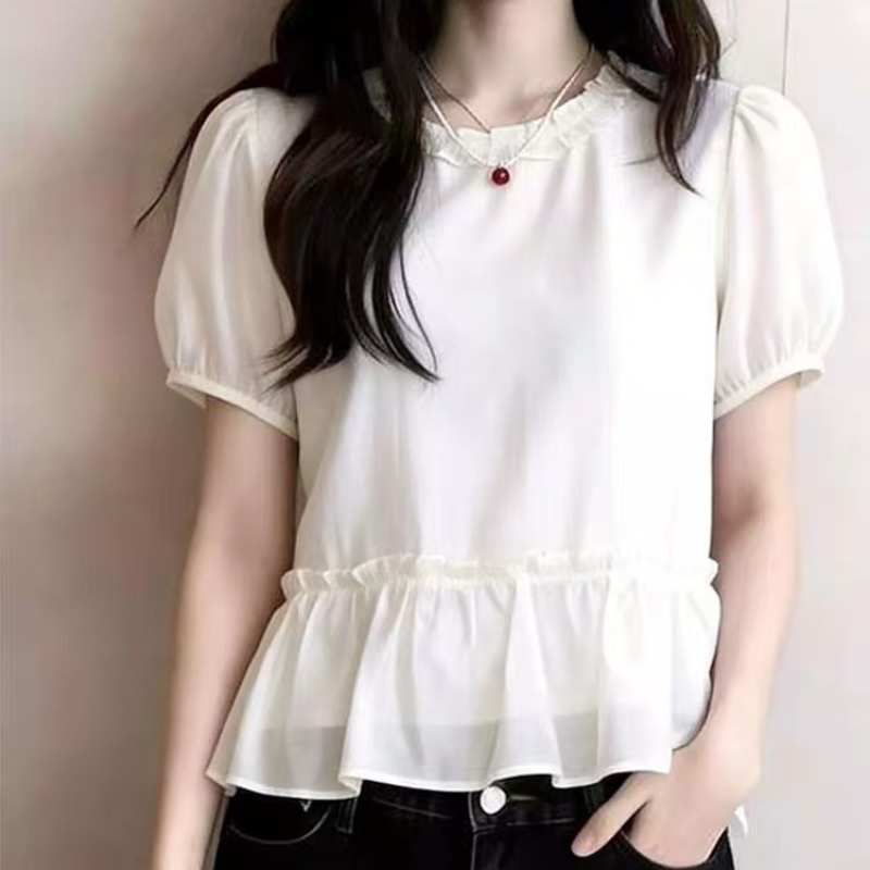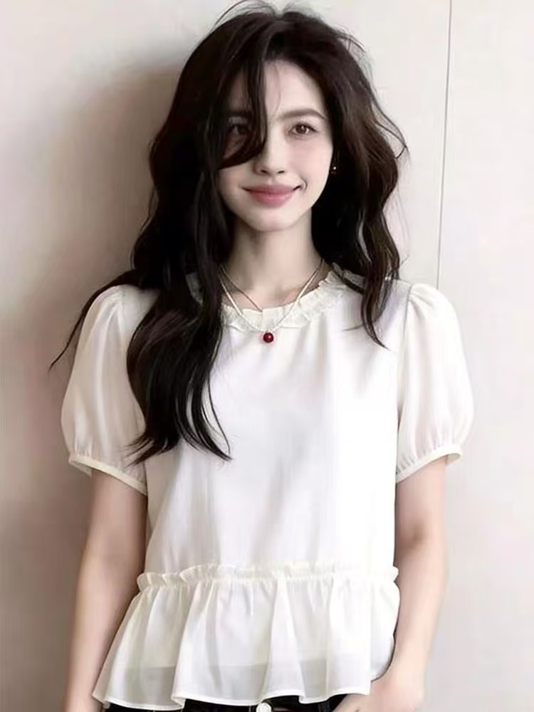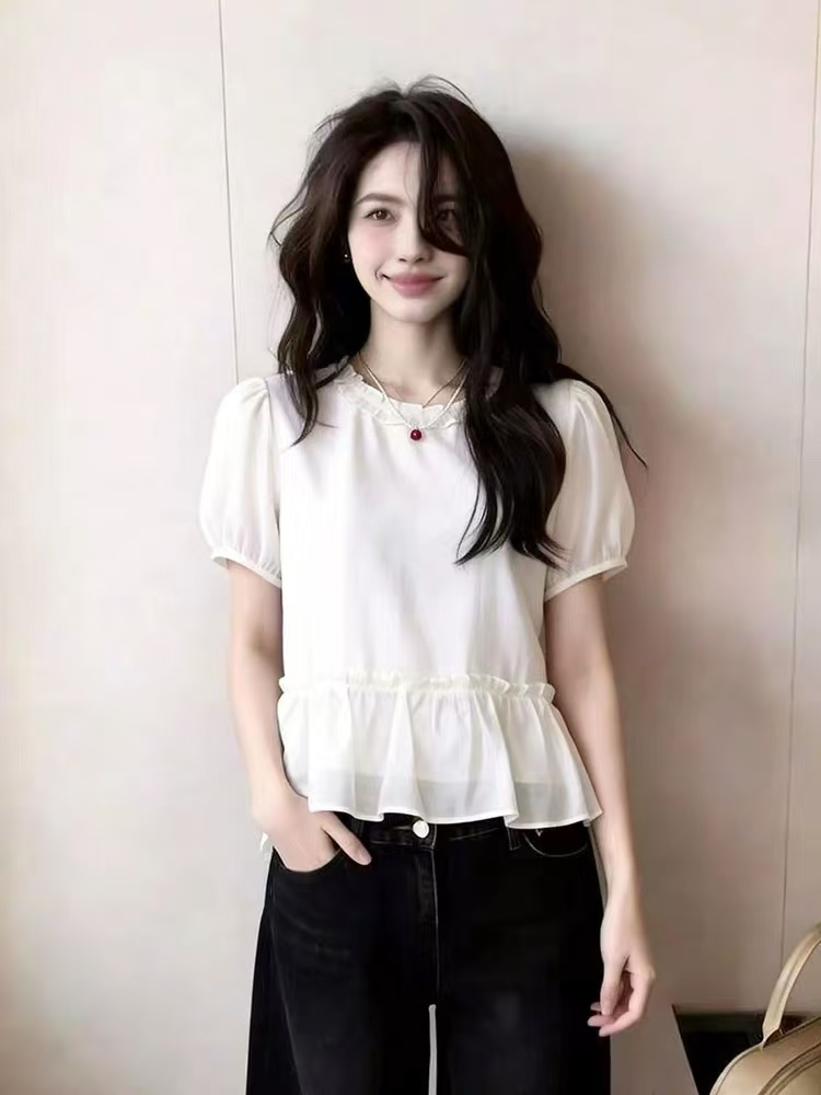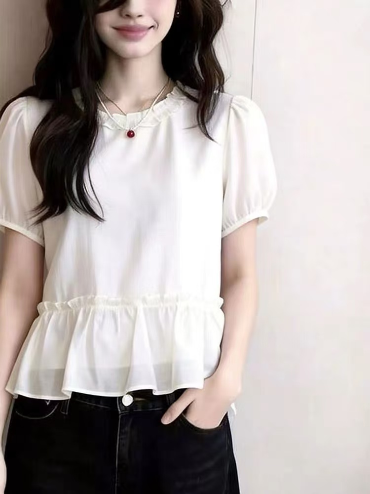 화이트 프릴 거품 소매 여성 셔츠 여름 새로운 부드러운 바람 외국 가스 허리 수축 슬림해 보이는 다용도 반팔 맨위