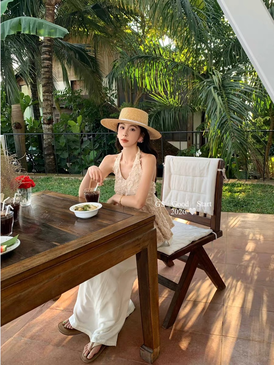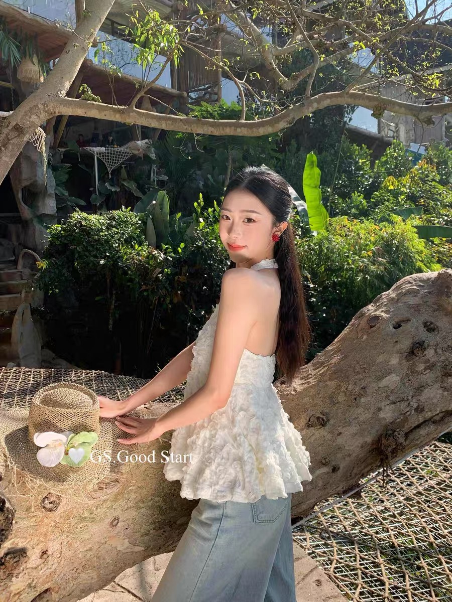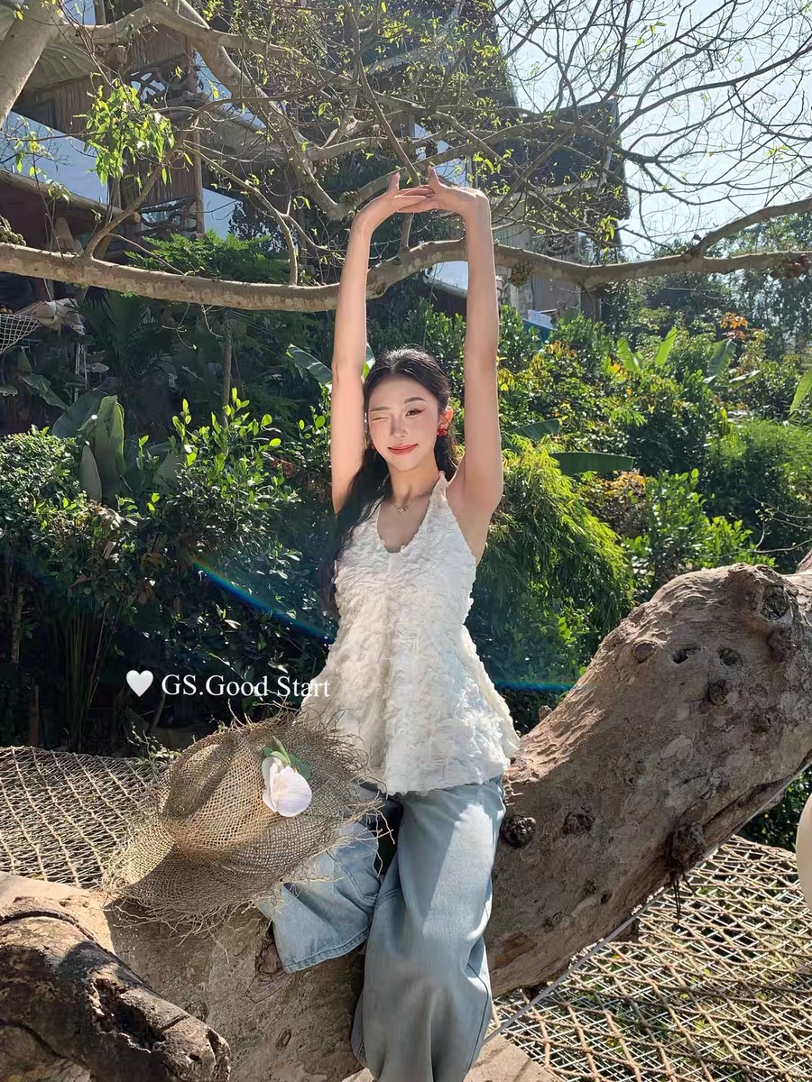 2026 새로운 3 차원 꽃 행침 목 캐미솔 여름 V넥 백리스 부드러운 바람 휴가 민소매 맨위