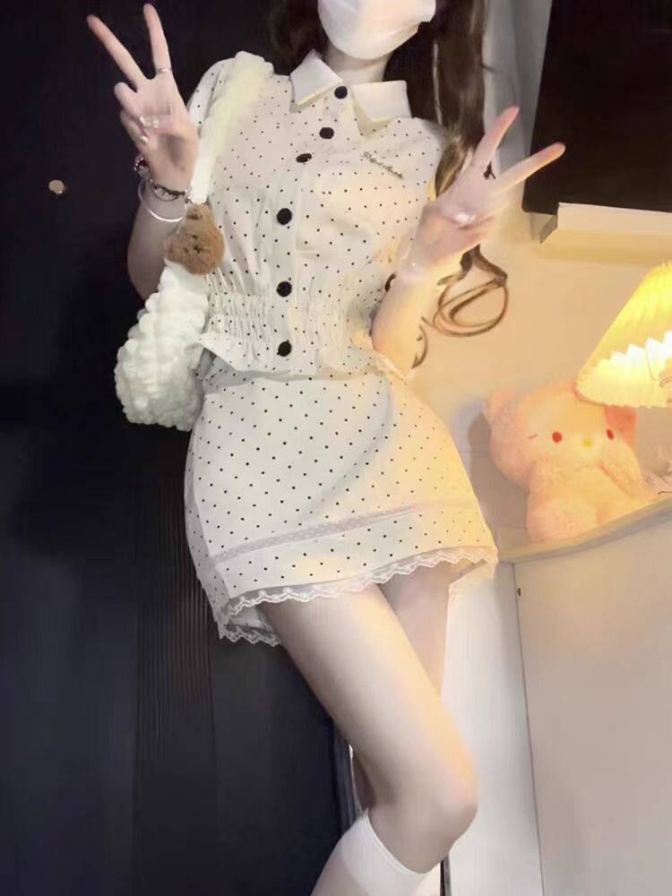 한 부서 학원 스타일 도트 무늬 세트 여성 여름 달콤함 쇼트 스타일 폴로 칼라 인형 셔츠 하이웨이스트 반신 미니 스커트 투피스 세트