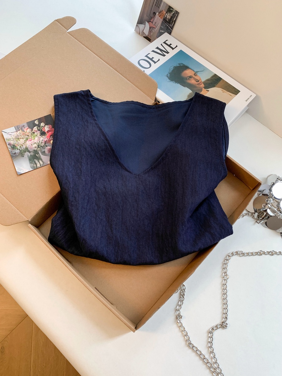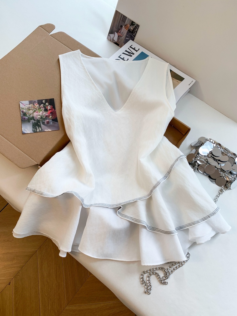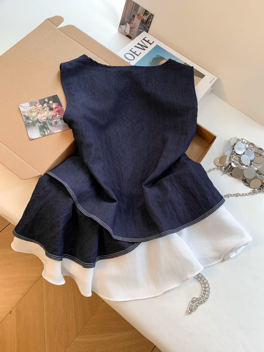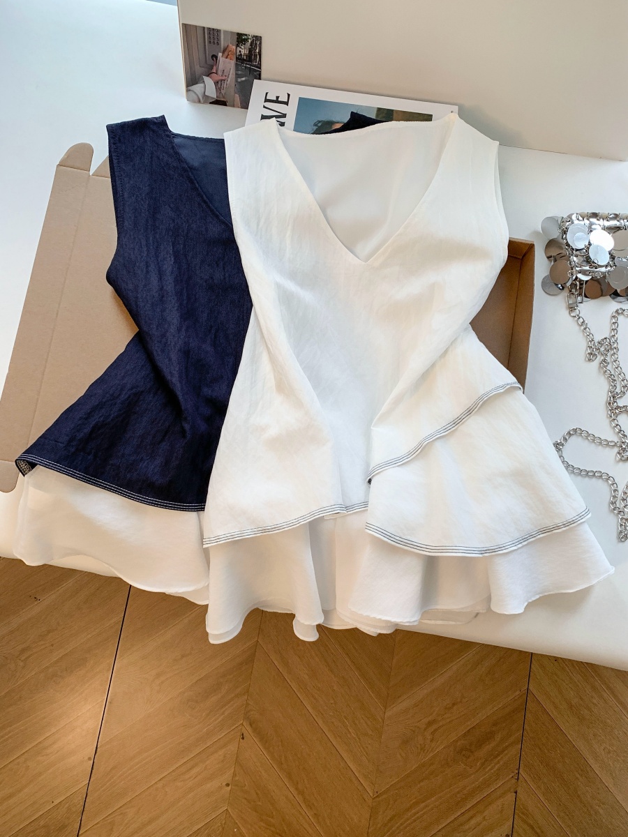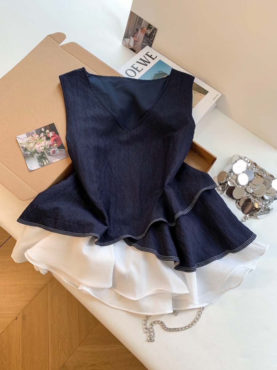 페이크 레이어드 패치워크 민소매 여성 셔츠 여름 불규칙 배색 Chic 슬림해 보이는 V넥 맨위